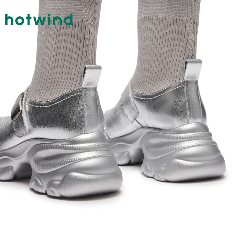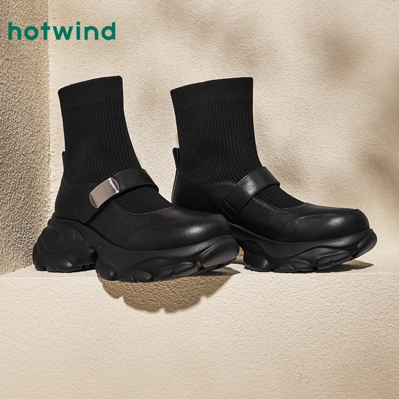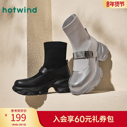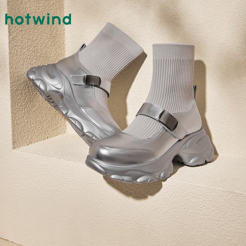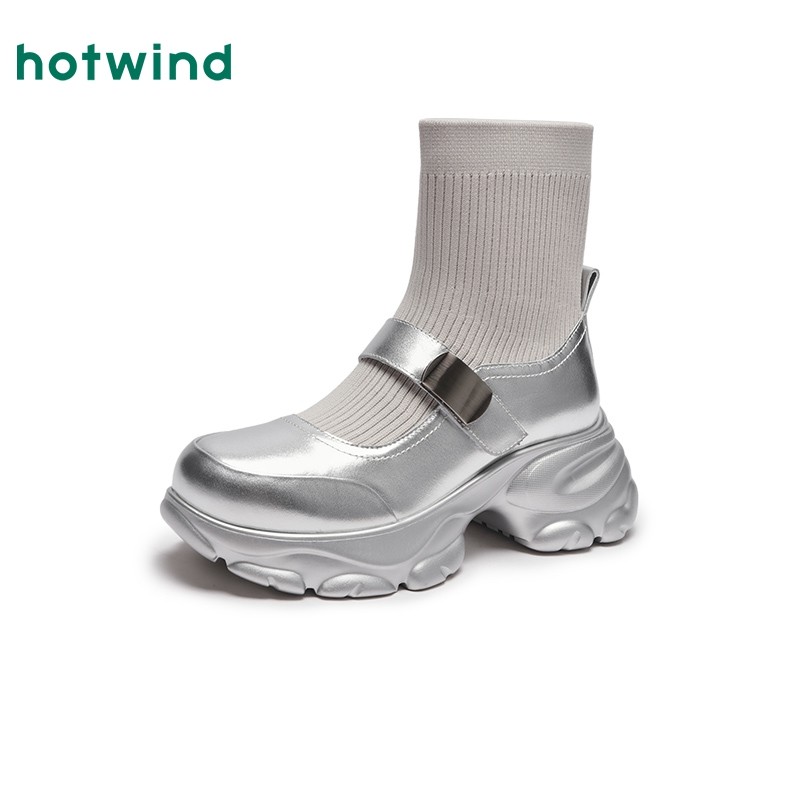 热风冬季新款女士质感厚底银色袜靴时尚拼接百搭短筒女靴子