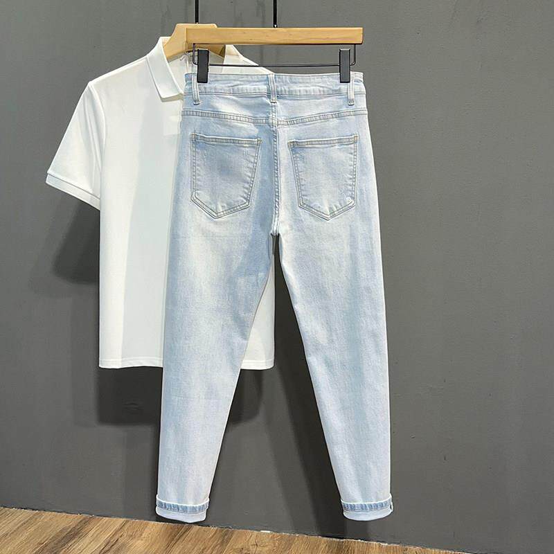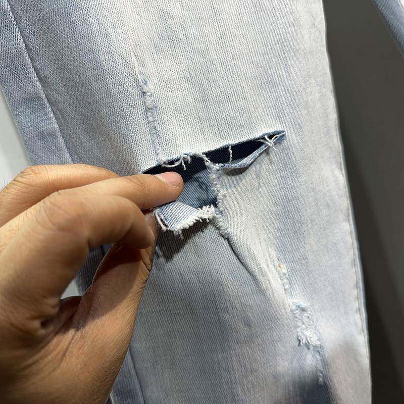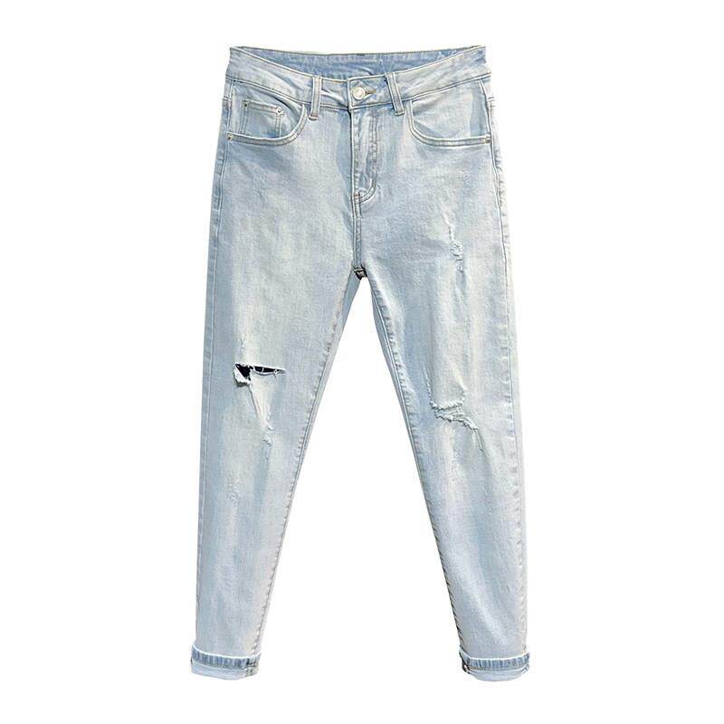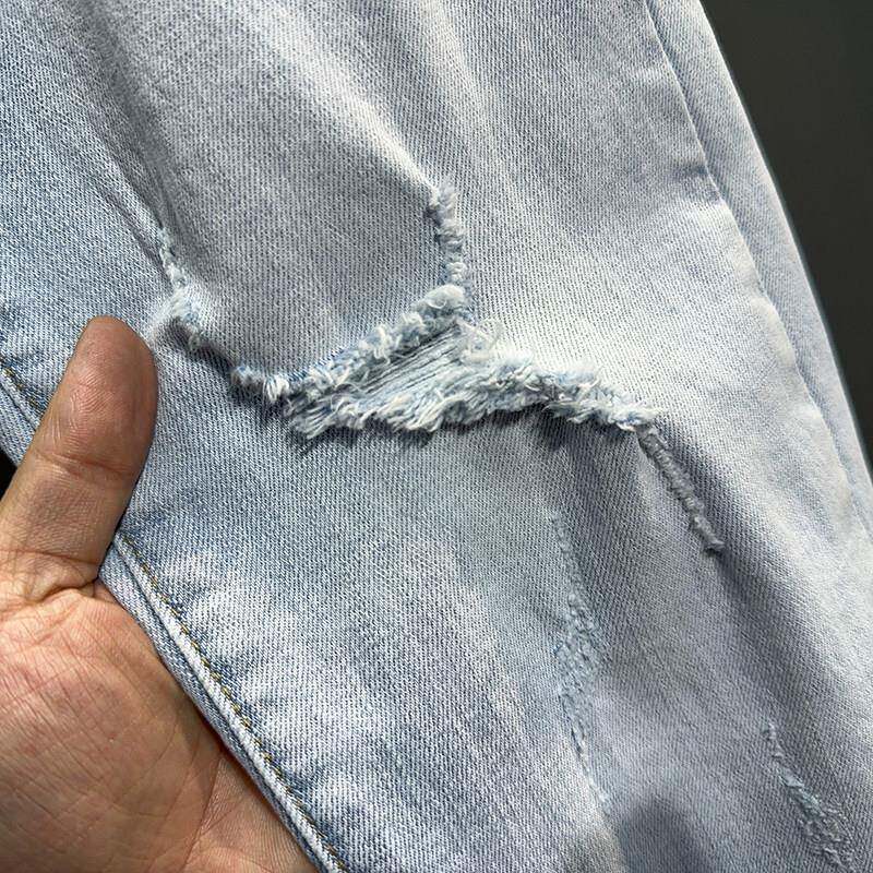春夏夏季浅色破洞九分牛仔裤男潮牌男痞帅乞丐修身小脚9分裤0226d