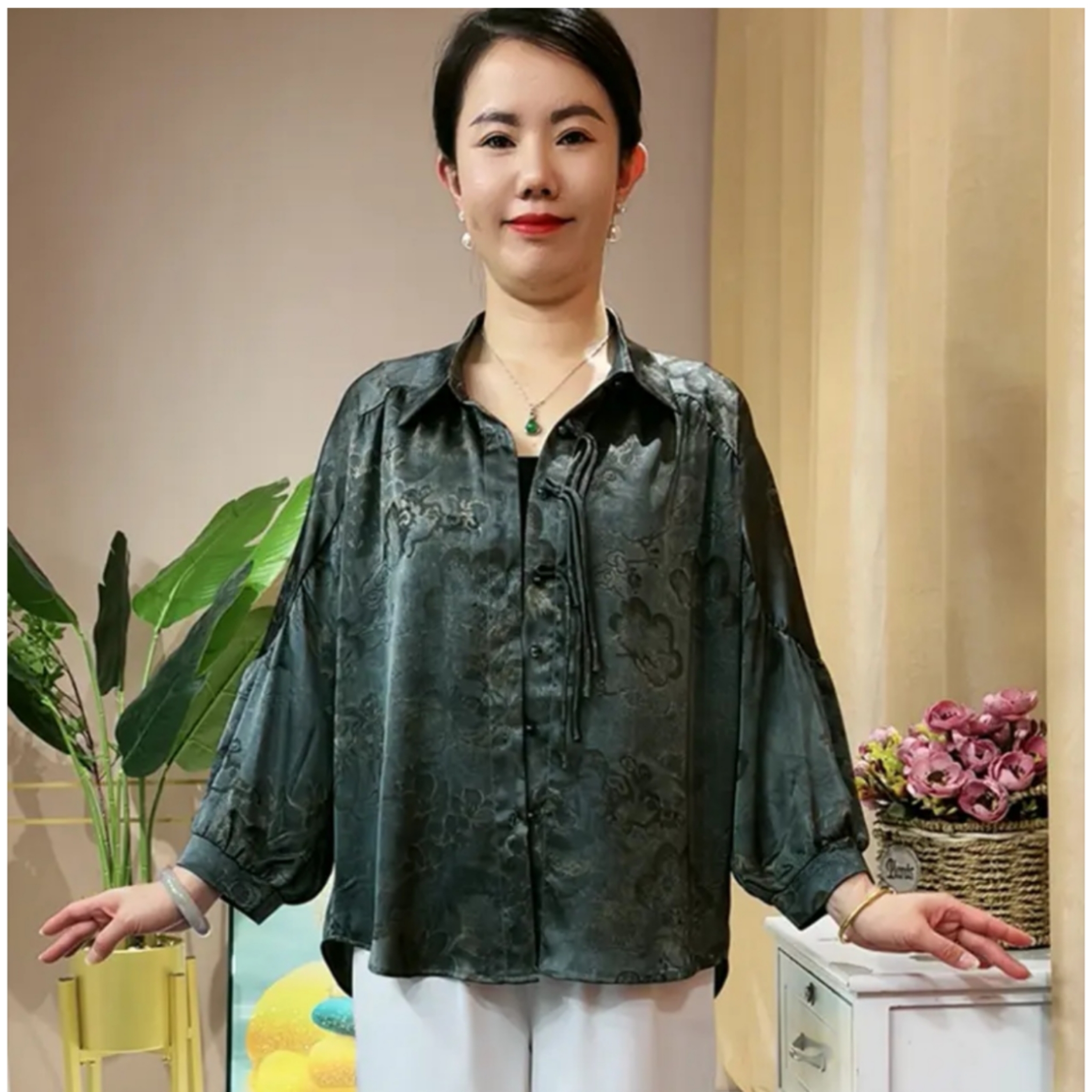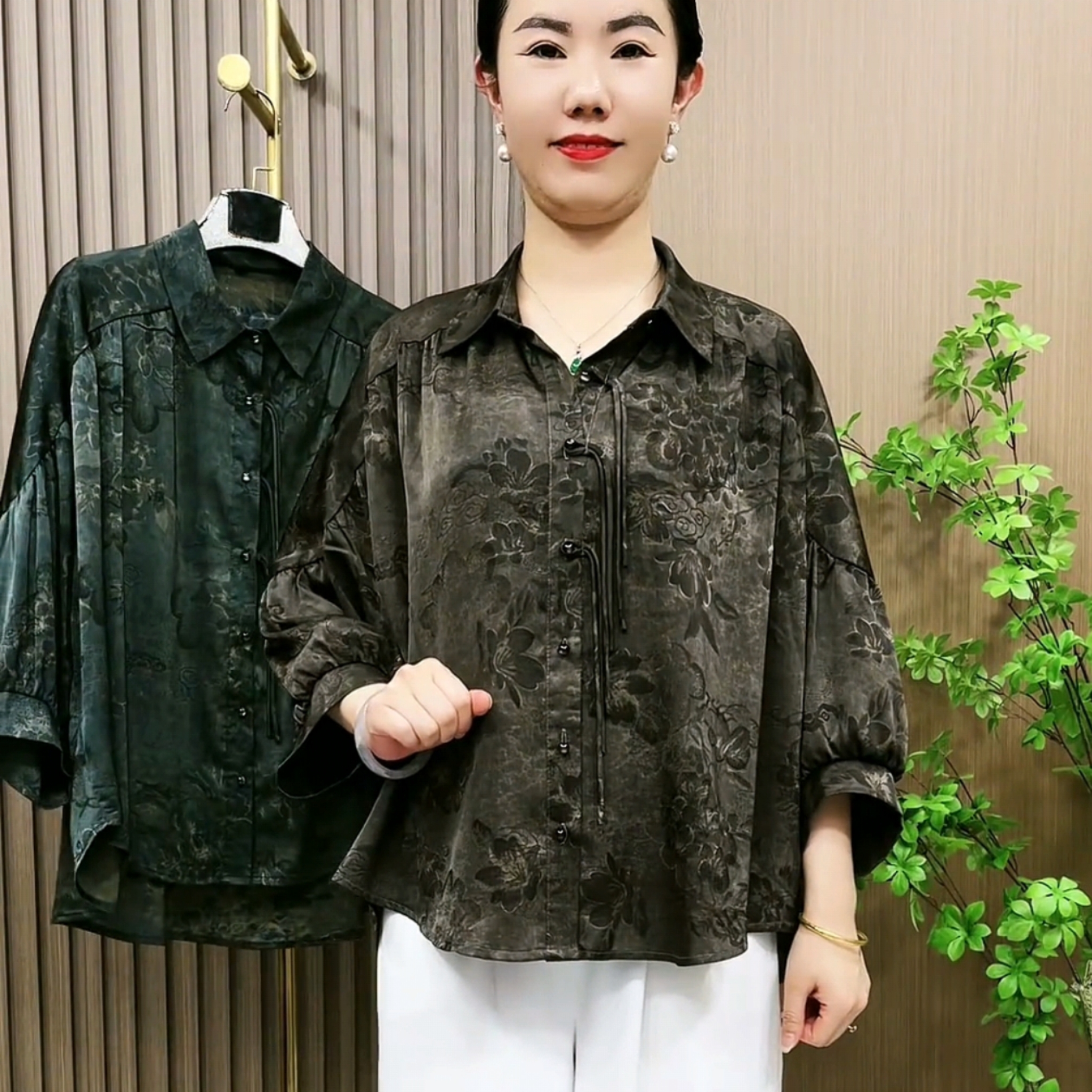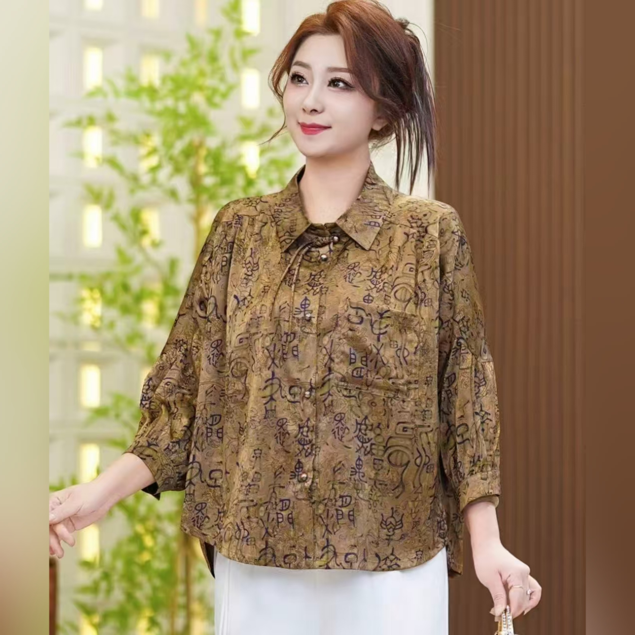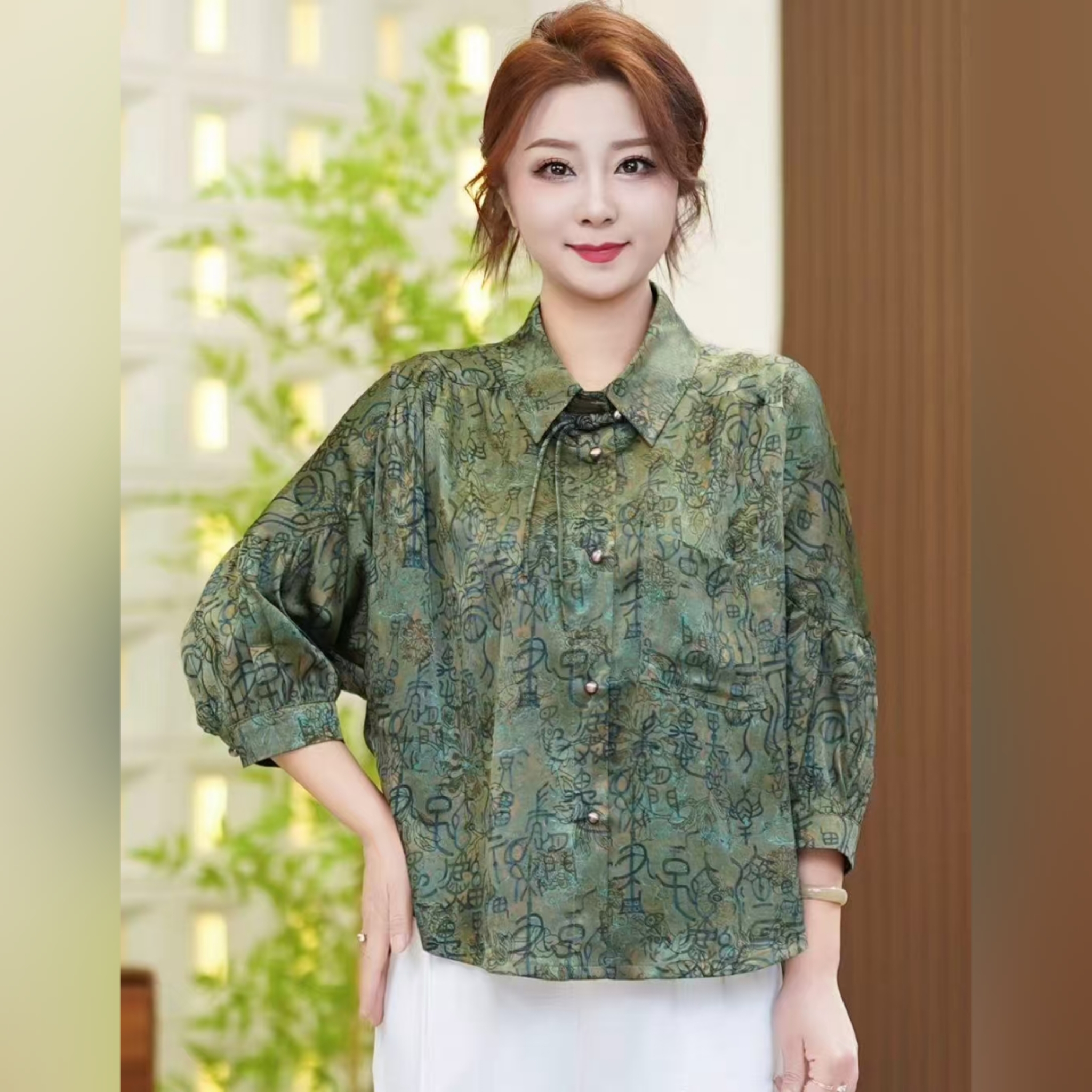 妈妈装香云纱小衫女夏季新款加肥大码衬衣洋气上衣水墨画女装衬衫