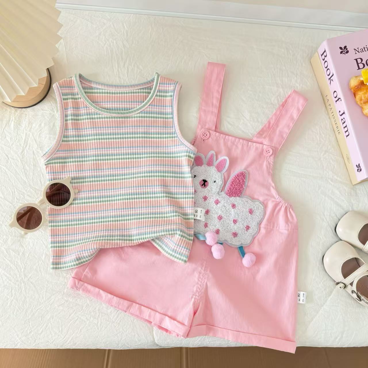 女童2025夏季条纹宽肩背带裤可爱小绵羊小天鹅套装儿童两件套