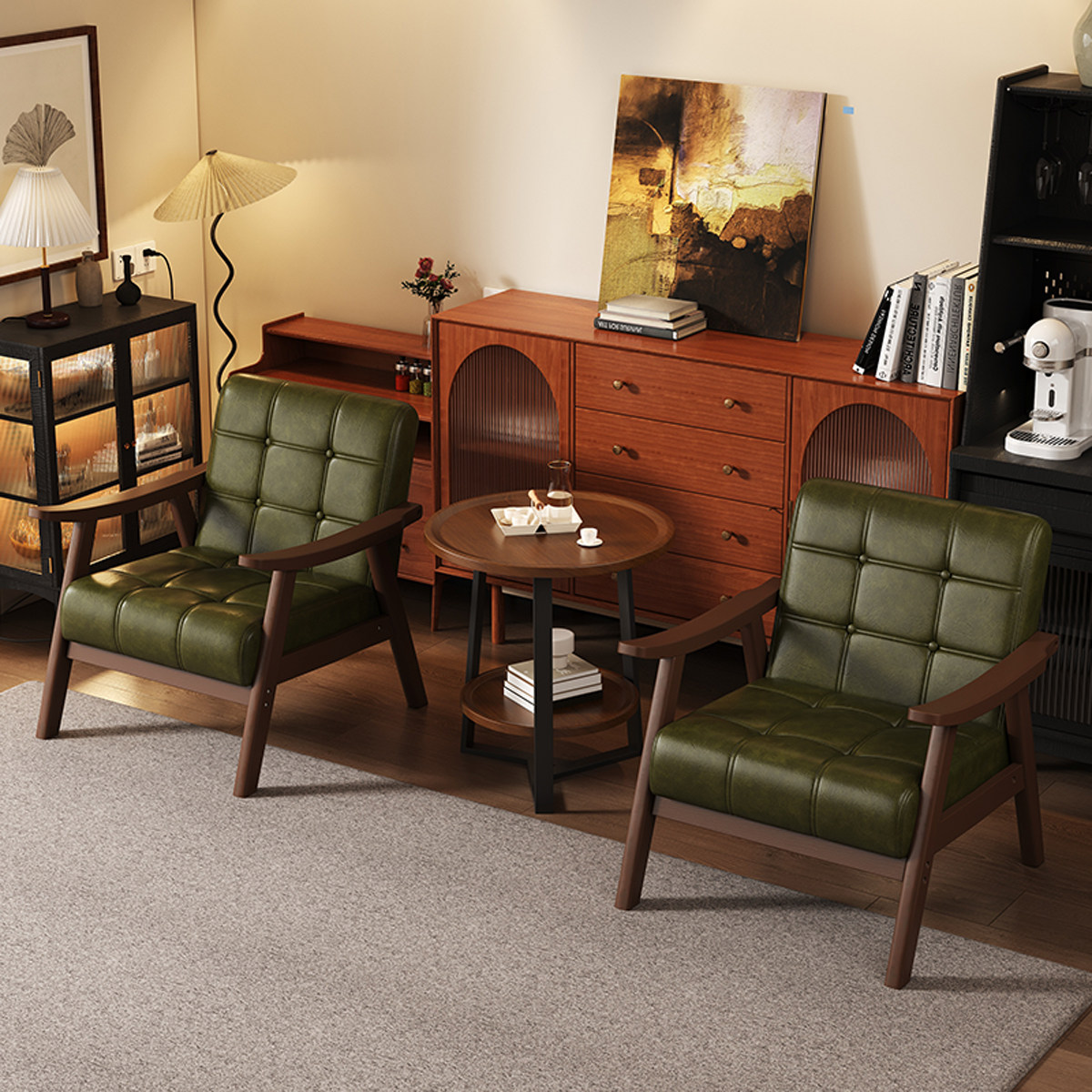小户型实木中古风客厅沙发双人绿色窄版阳台简易木质卧室小型房间