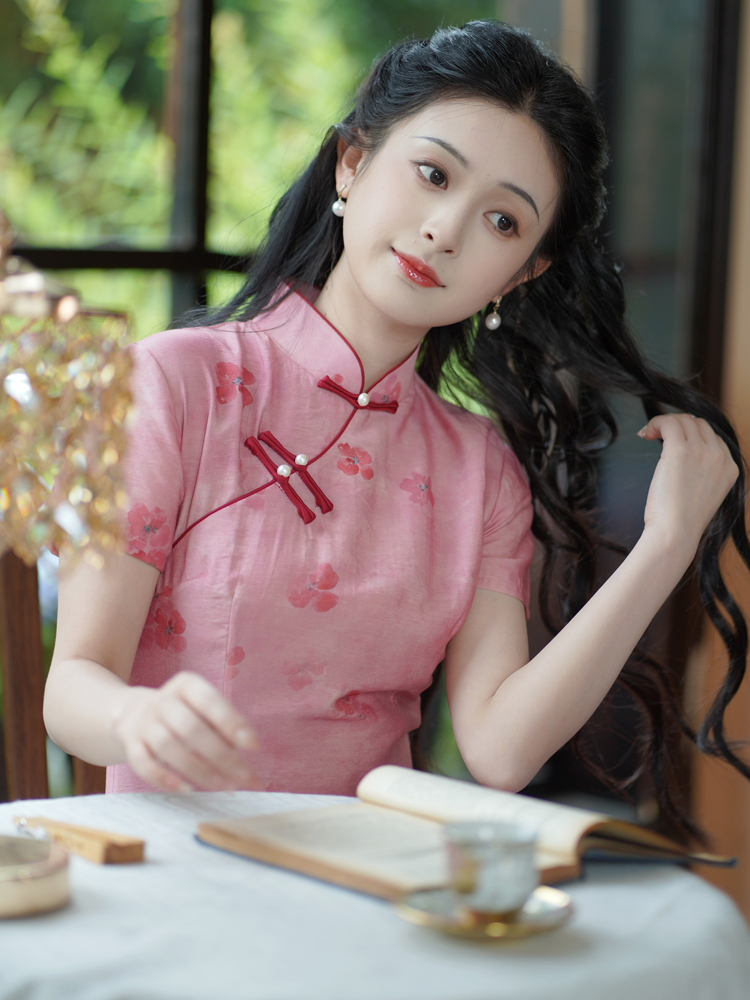 新中式改良少女粉色奥黛旗袍