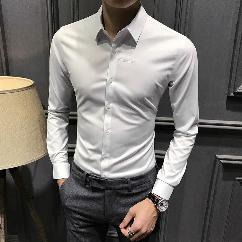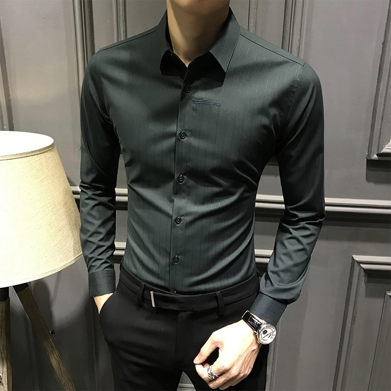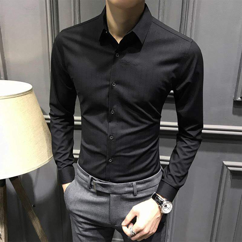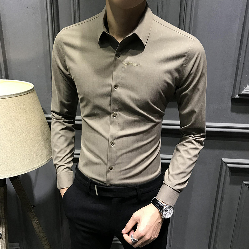 男士秋季条纹衬衫长袖新款高端商务刺绣衬衣潮休闲修身免烫上衣寸