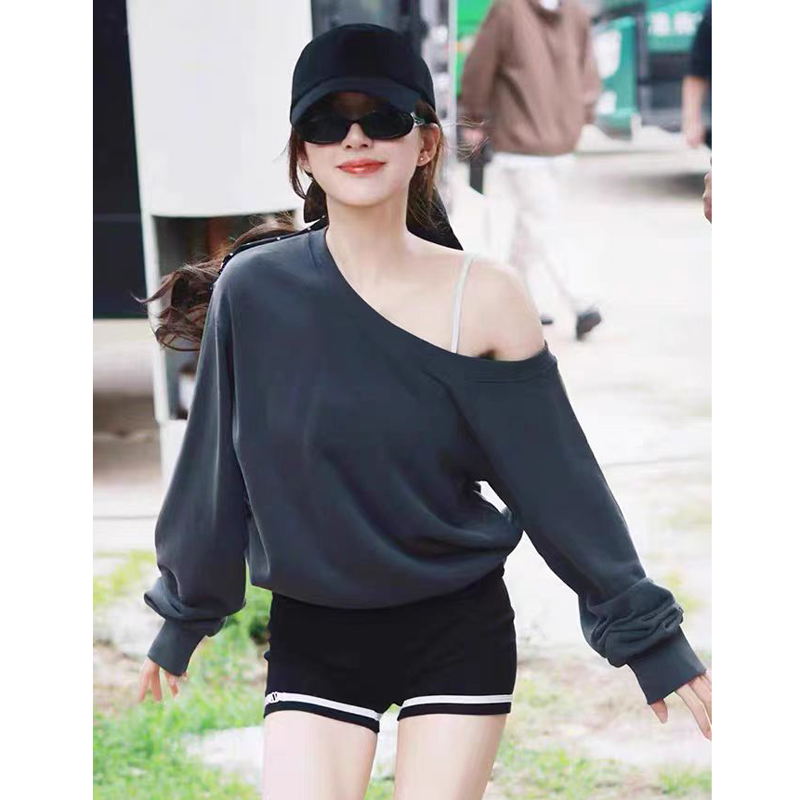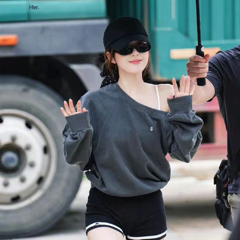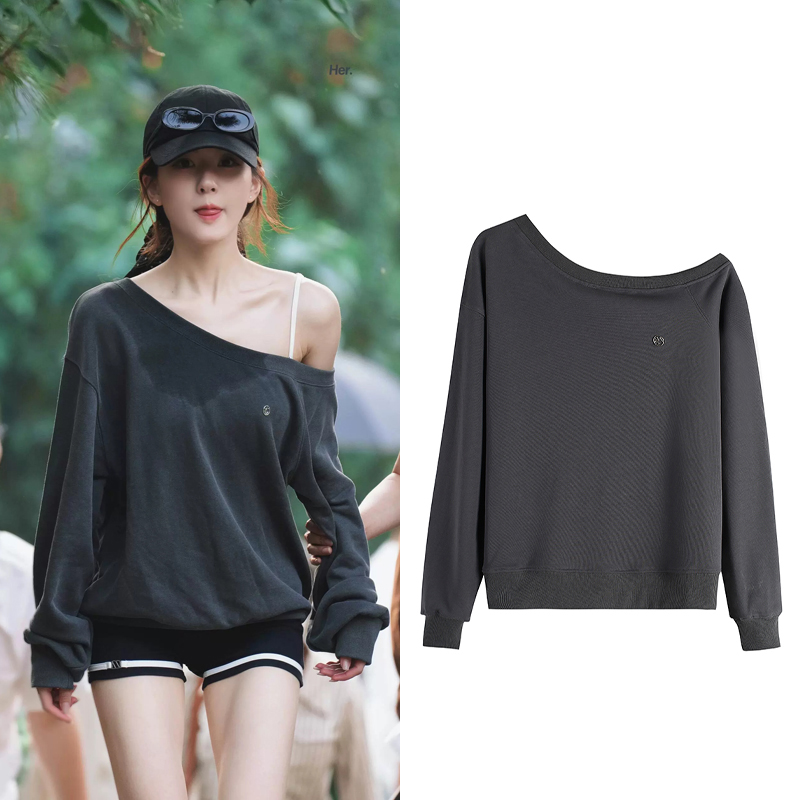 赵露思明星同款美式复古斜一字肩卫衣时尚露肩上衣女春秋新款