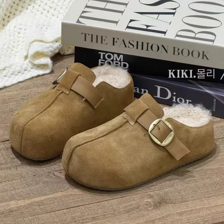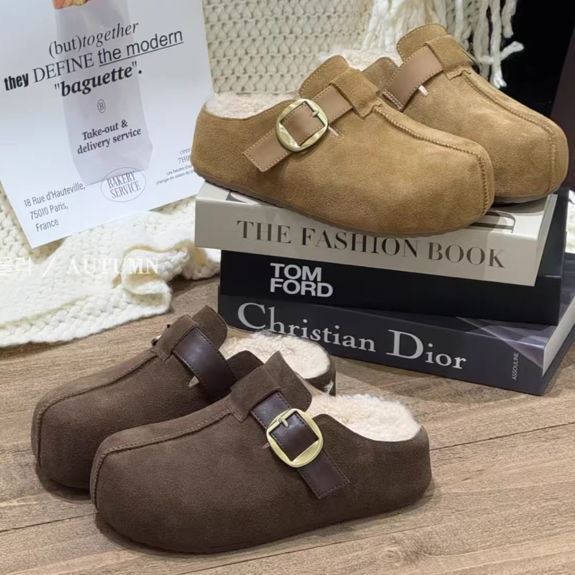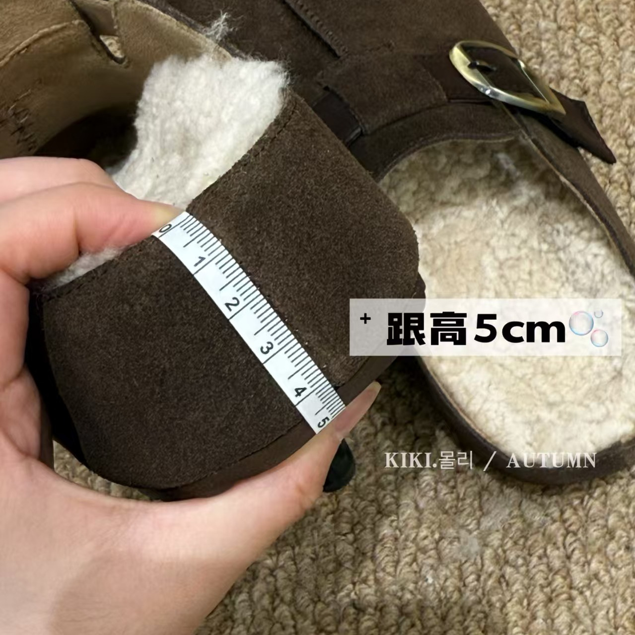 欧货磨砂真皮大头羊毛博肯鞋女包头半拖鞋瓢鞋松糕厚底穆勒勃肯鞋