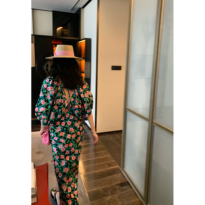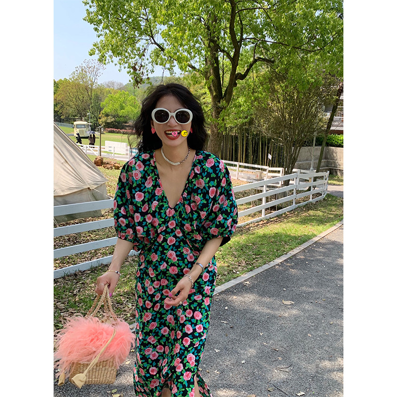 落落狷介 碎花连衣裙2025新款女设计感小众V领裙子宽松开叉长裙