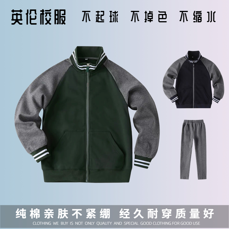 英伦风学生墨绿藏青拉链运动服套装 春秋款小学生纯棉学院棒球服