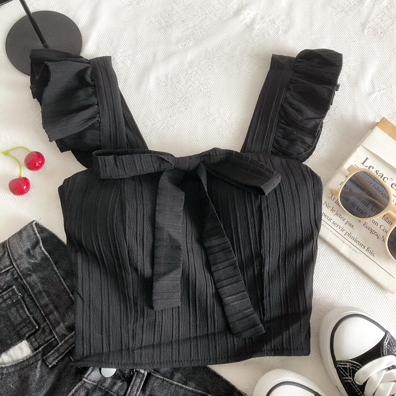 海边度假风百搭绑带蝴蝶结飞飞袖带胸垫显瘦短款吊带背心上衣女