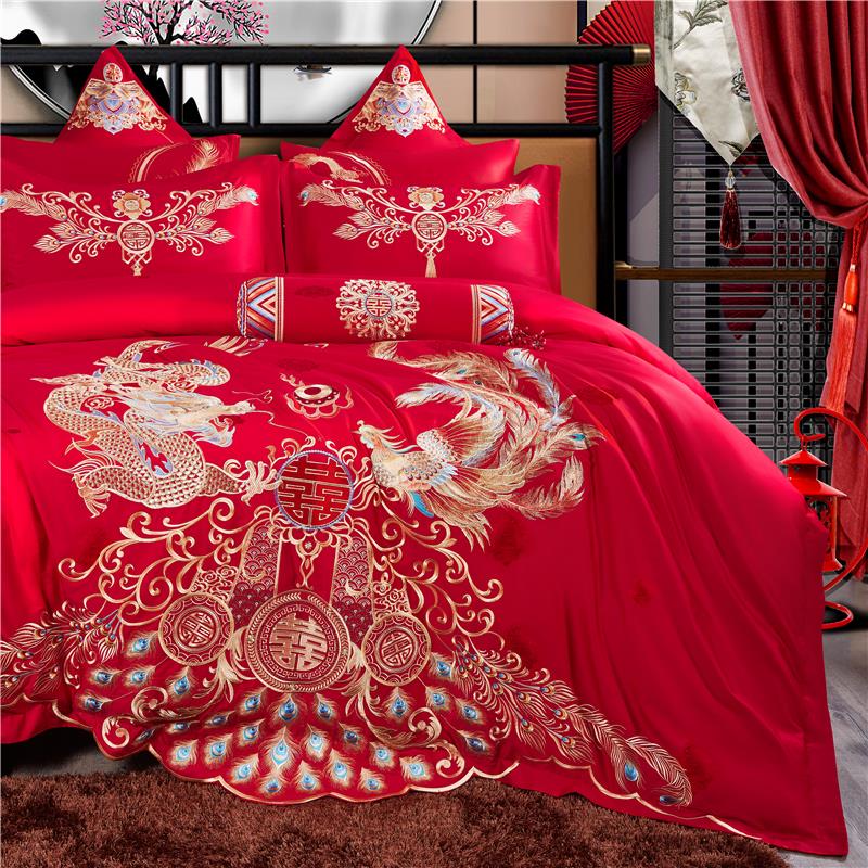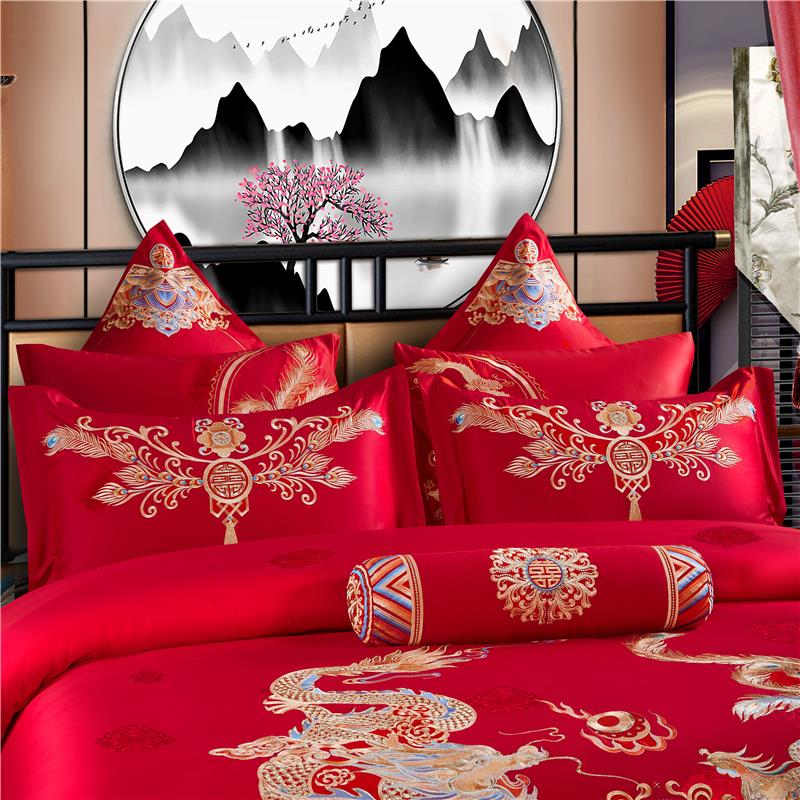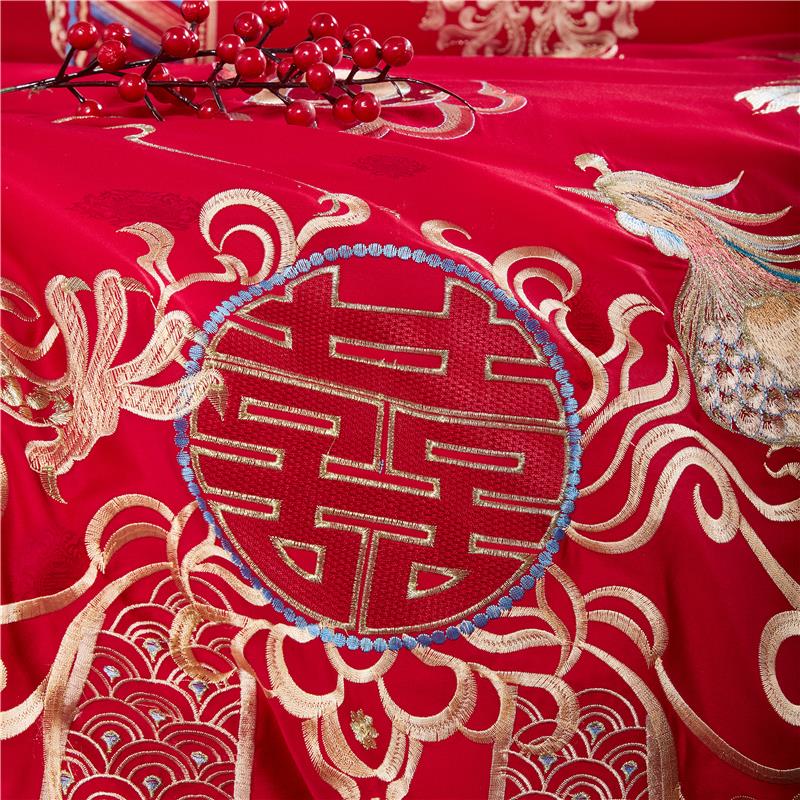 100s支长绒棉婚庆四件套大红全棉刺绣结婚十件套床上用品纯棉套件