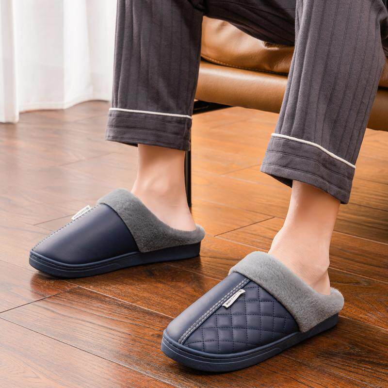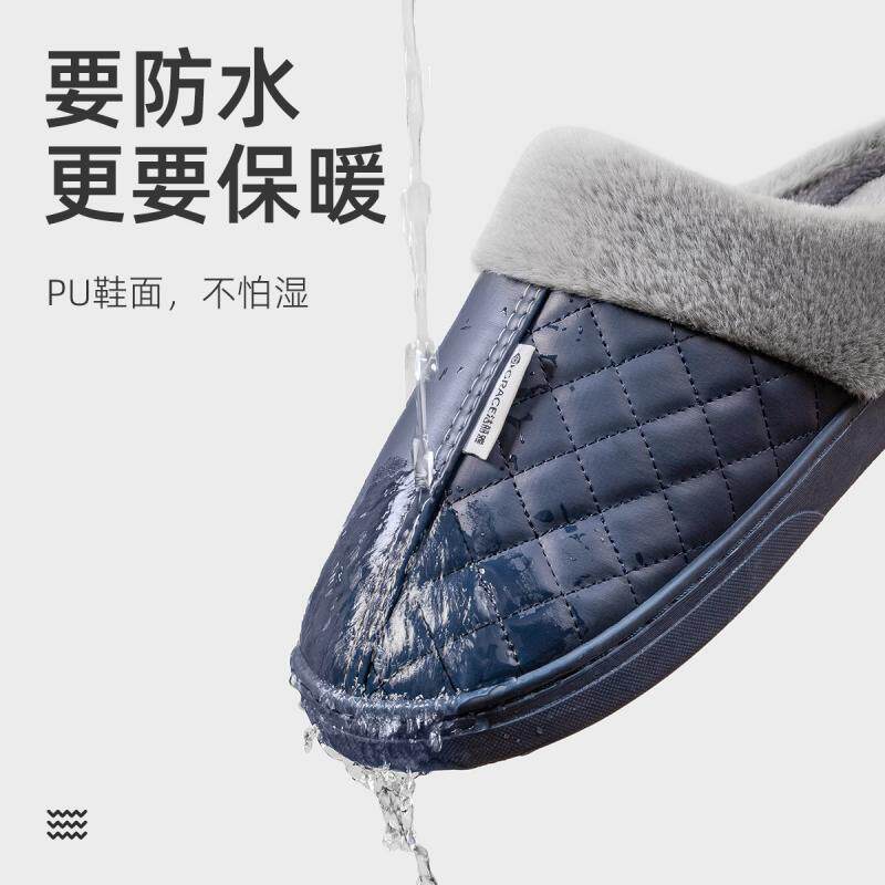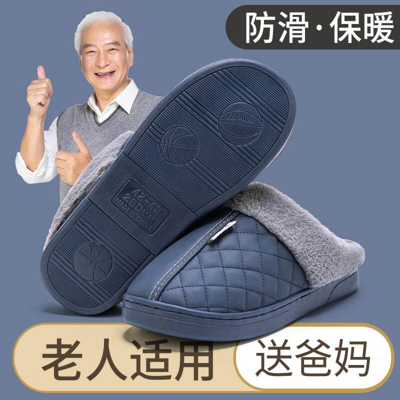 洁丽雅老人防水棉拖鞋男士秋冬季室内家居防滑大码中老年皮面拖鞋