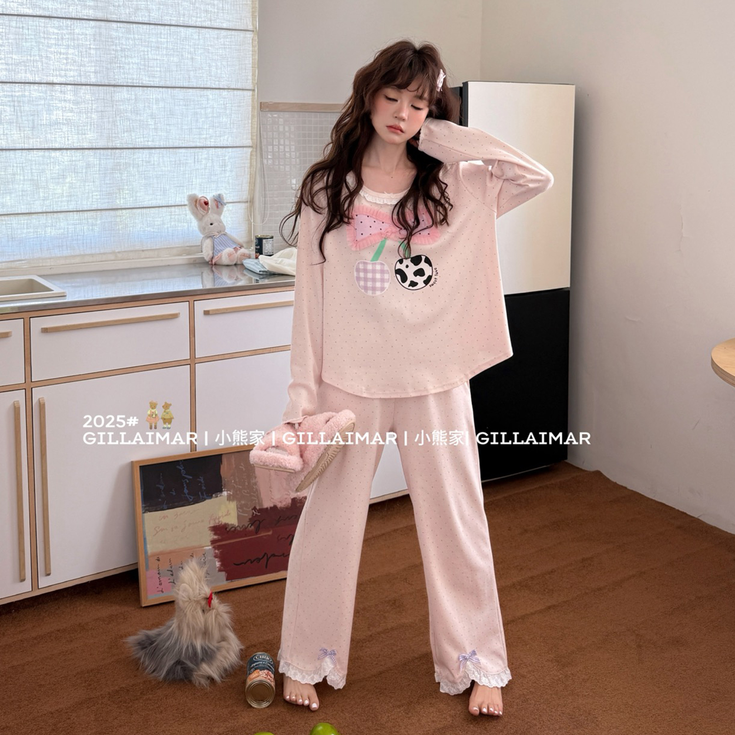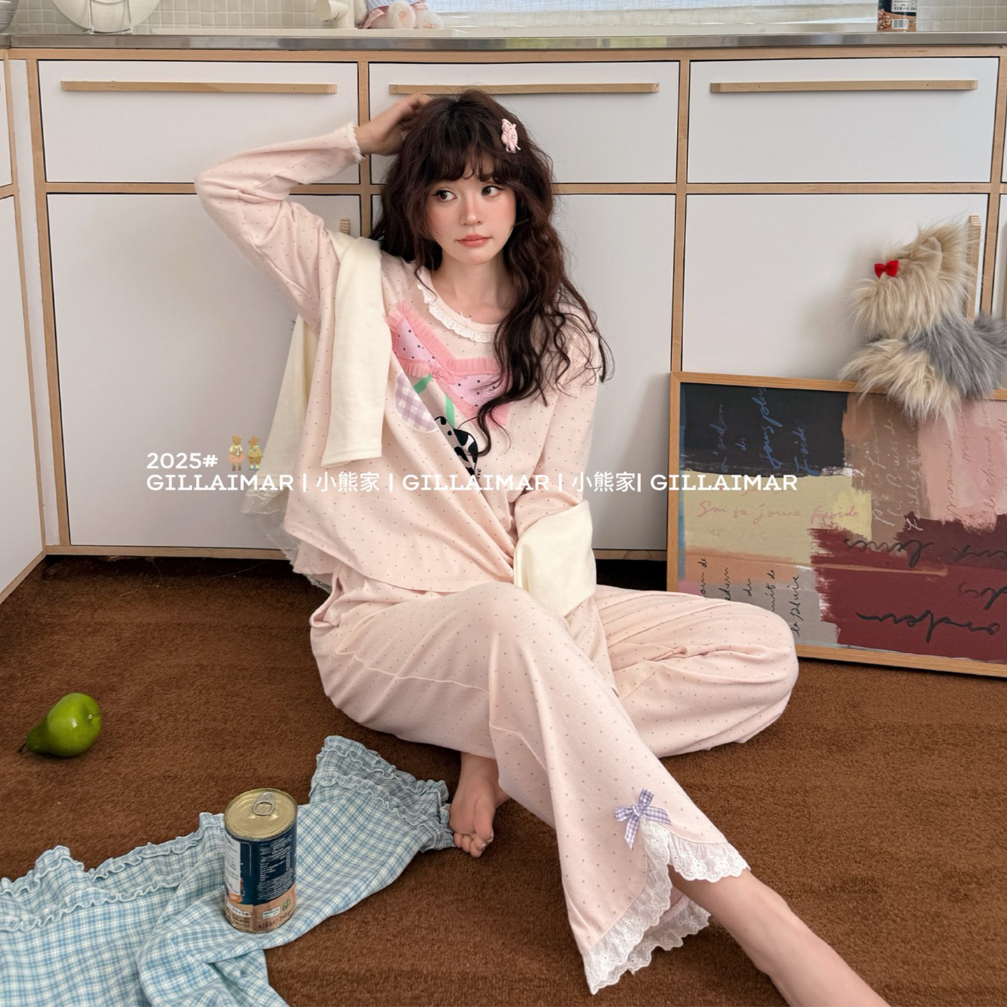 Gill Aimar小熊家2025秋冬新款睡衣女圆领波点蝴蝶结宽松家居服