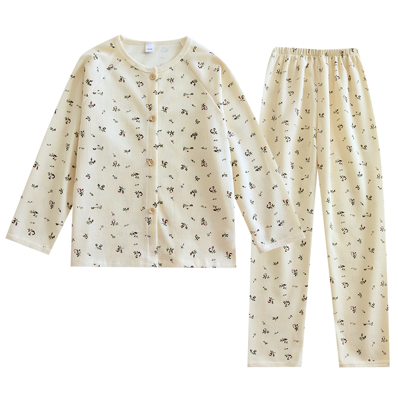 儿童春夏薄款华夫格睡衣套装女童圆领印花可外穿小清新开衫家居服