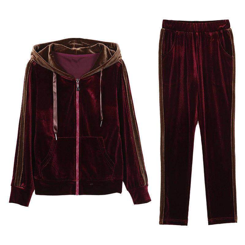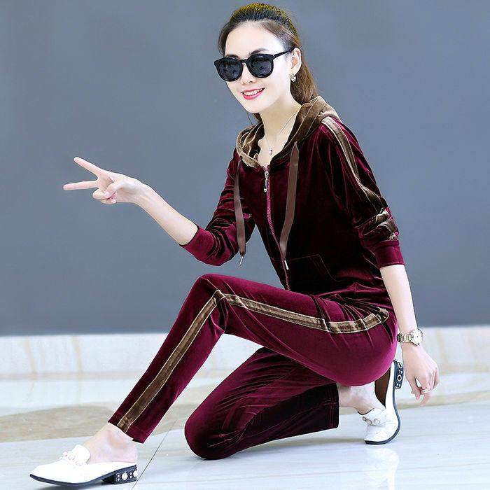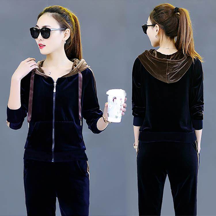 春季春秋季丝绒休闲运动套装女大码宽松开衫拉链连帽运动服0119ud