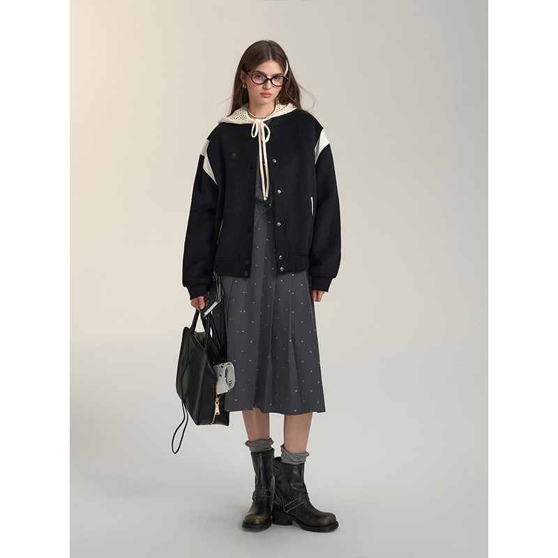 SOMESOWE 仿皮革拼接毛呢棒球服