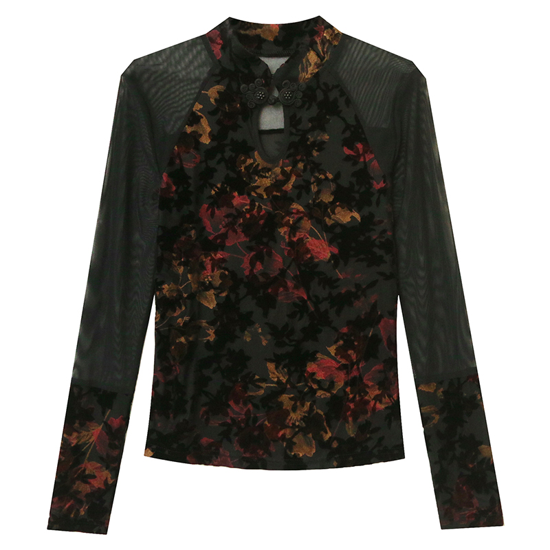 加绒网纱打底衫女2025秋冬新款性感镂空盘扣长袖T恤紧身内搭上衣