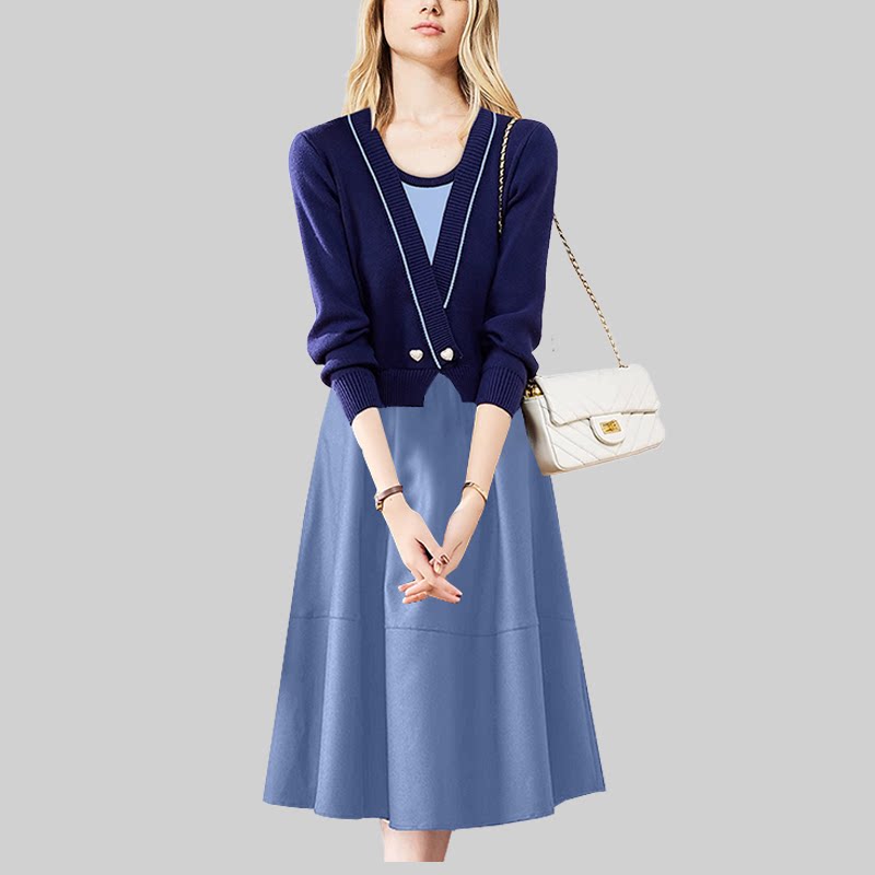 温柔风气质蓝粉色套装女2026春季新款泡泡袖毛衣印花半身裙两件套