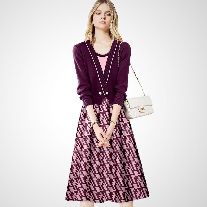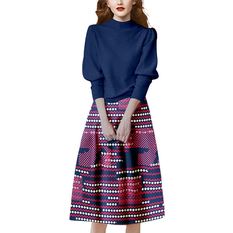 泡泡袖毛衣印花半身裙两件套