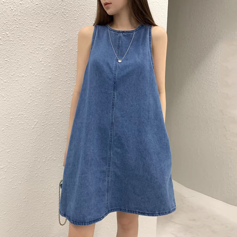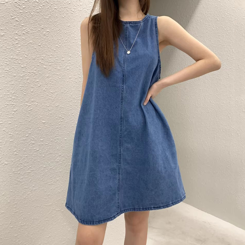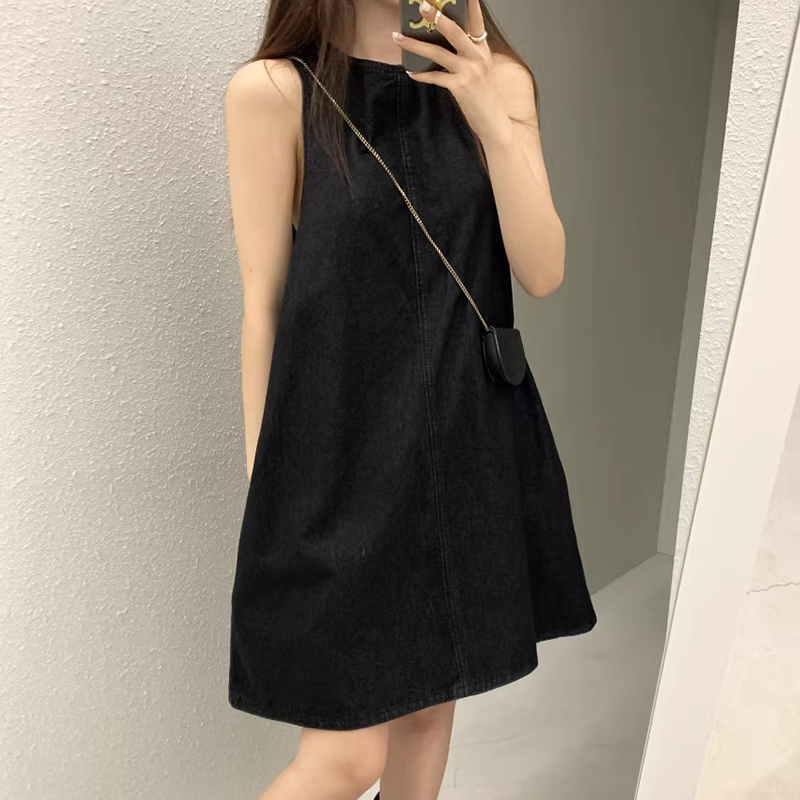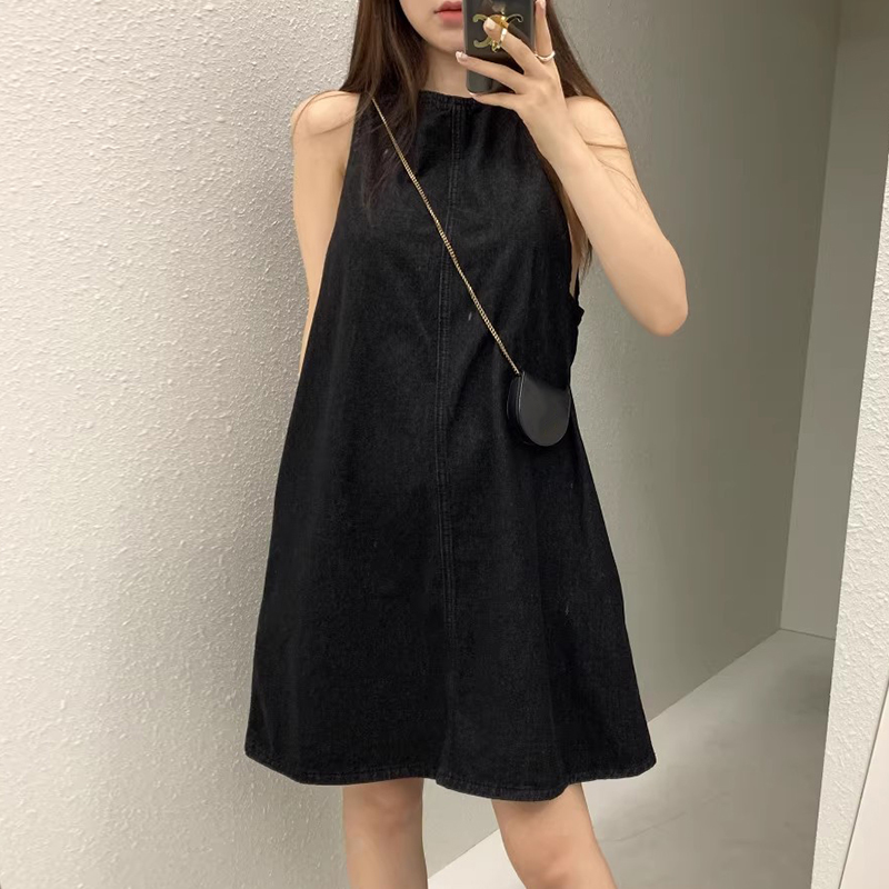 韩国chic复古气质后背镂空系带设计宽松无袖背心牛仔连衣裙短裙女