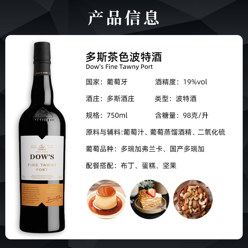 Dow'sTawny Port茶色波特酒葡萄牙甜酒750ml微醺红酒加强型葡萄酒