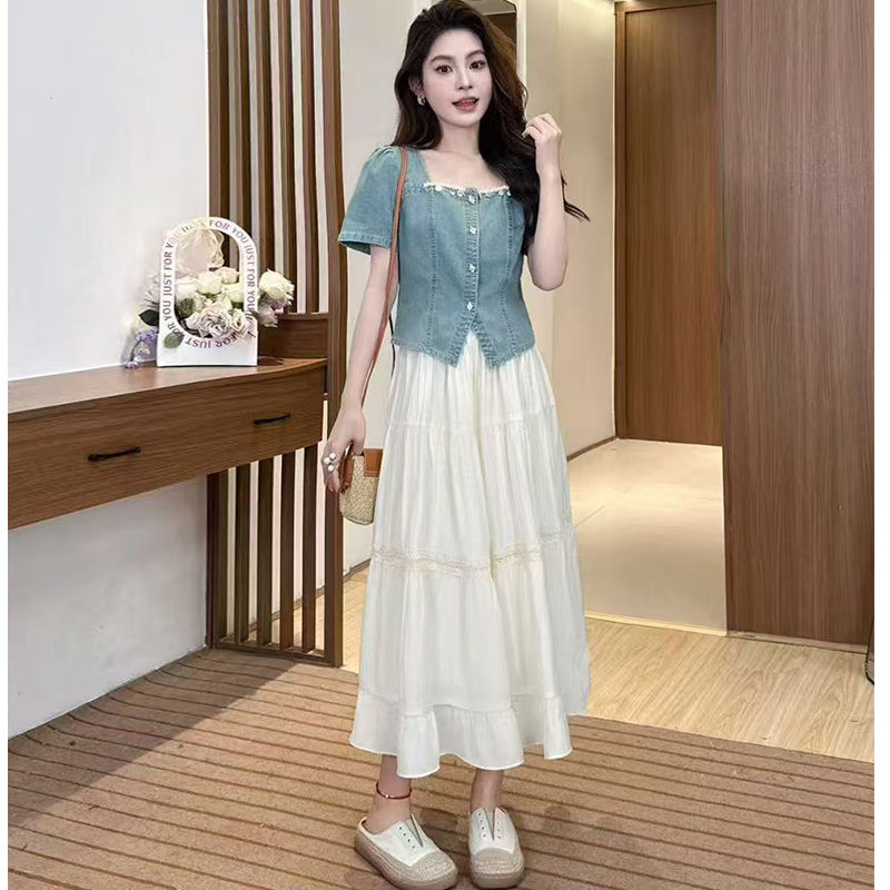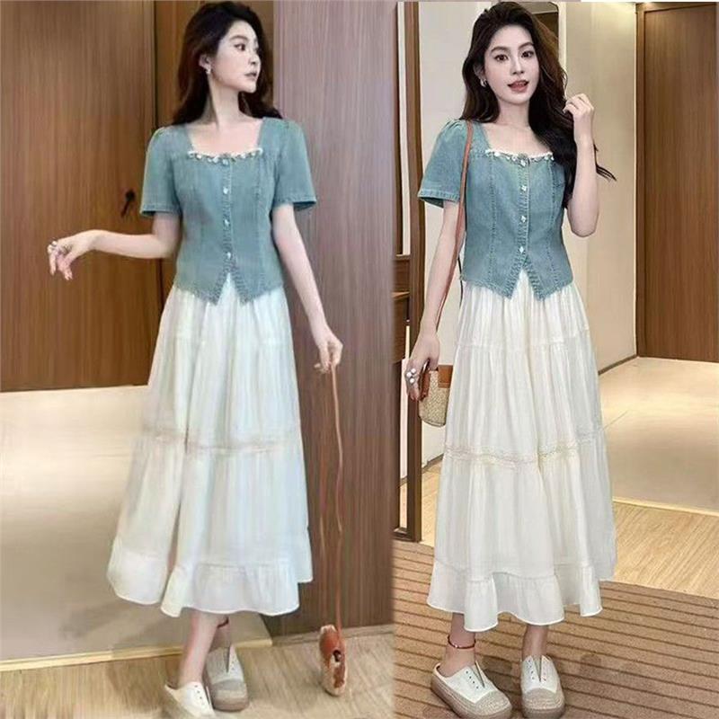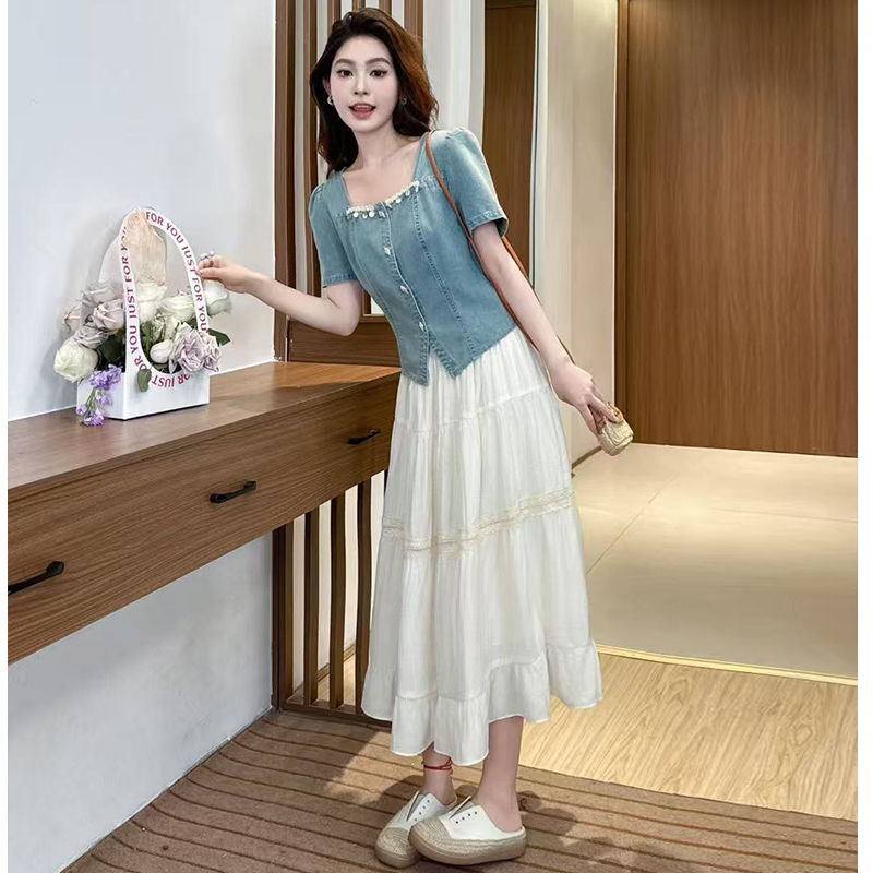 2025夏季新款时尚气质高级感显瘦牛仔上衣网纱半身裙两件套女套装