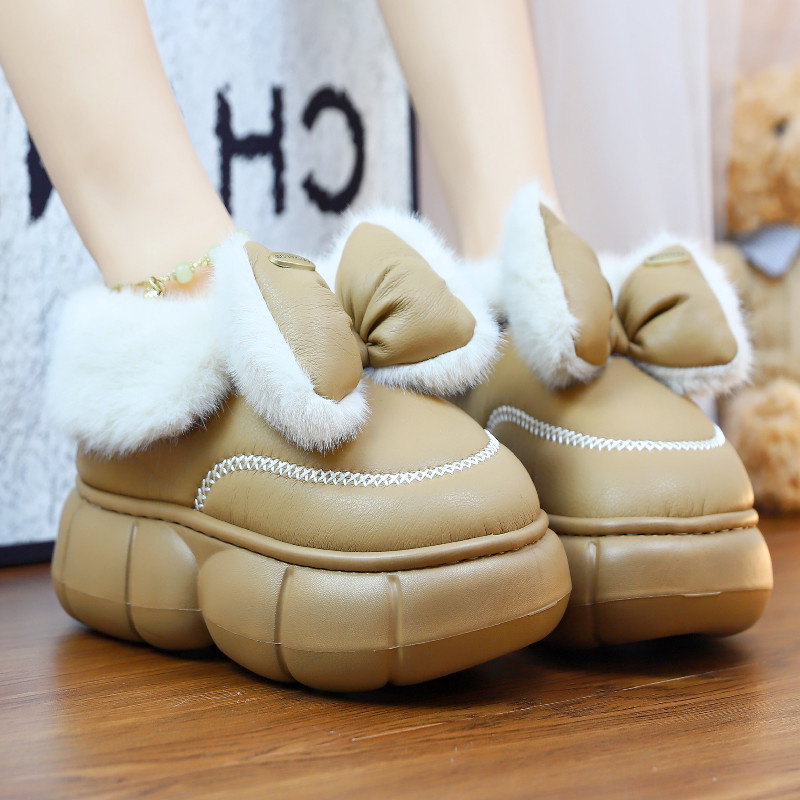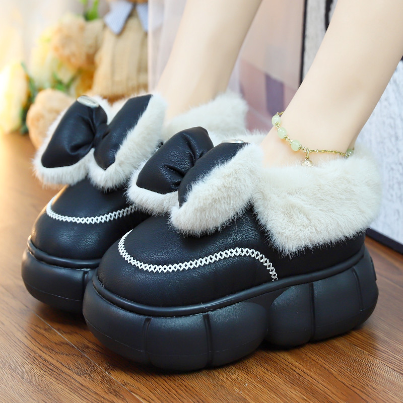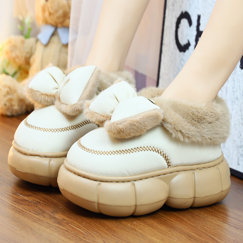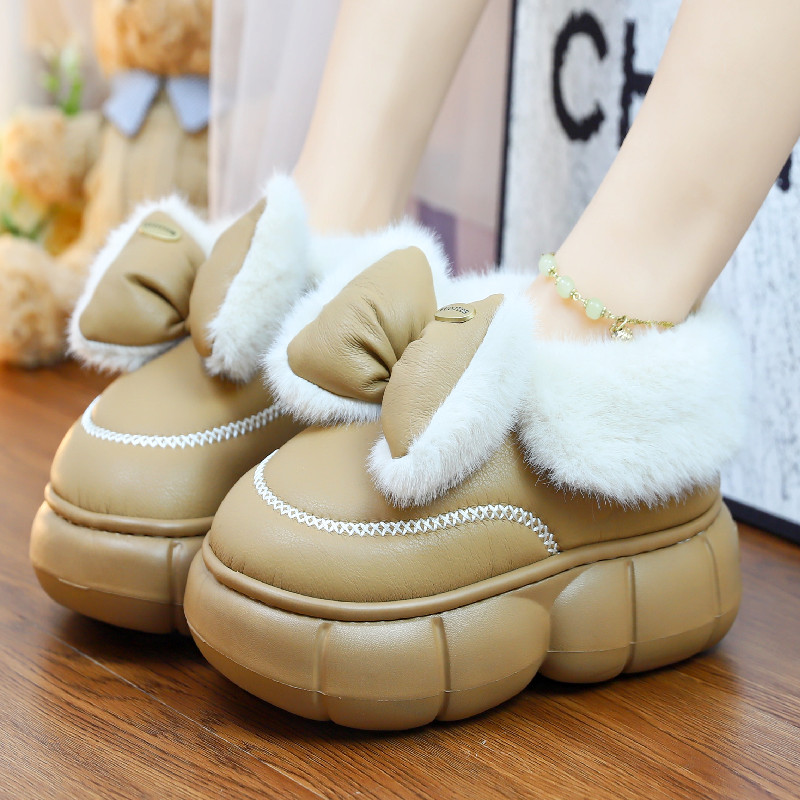 卉兹沐蝴蝶结防水棉拖鞋女冬季外穿防滑新款室内保暖加绒雪地靴