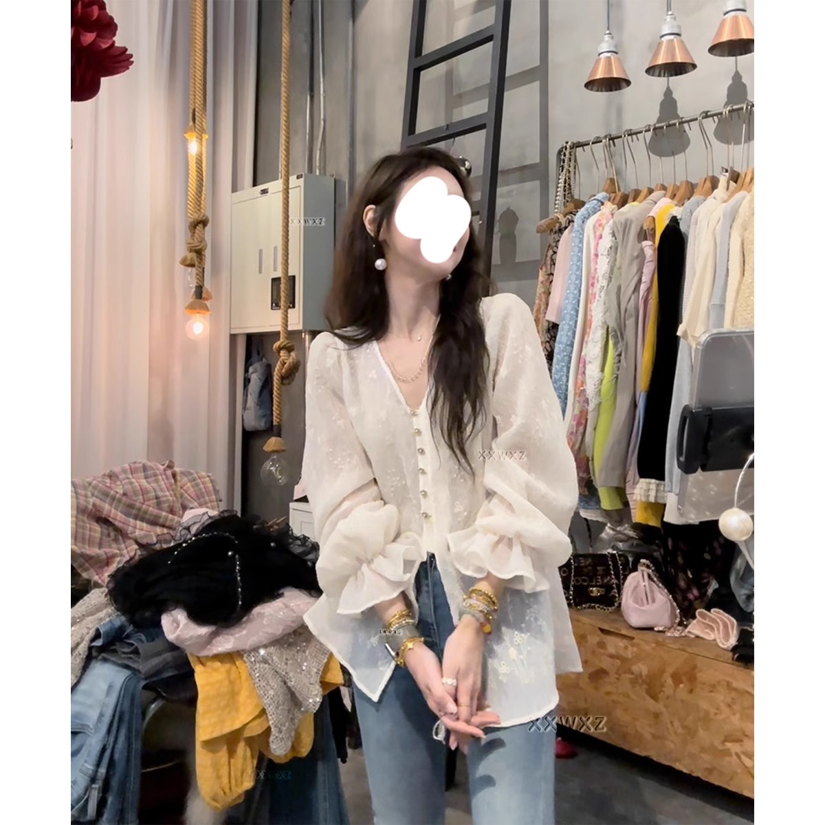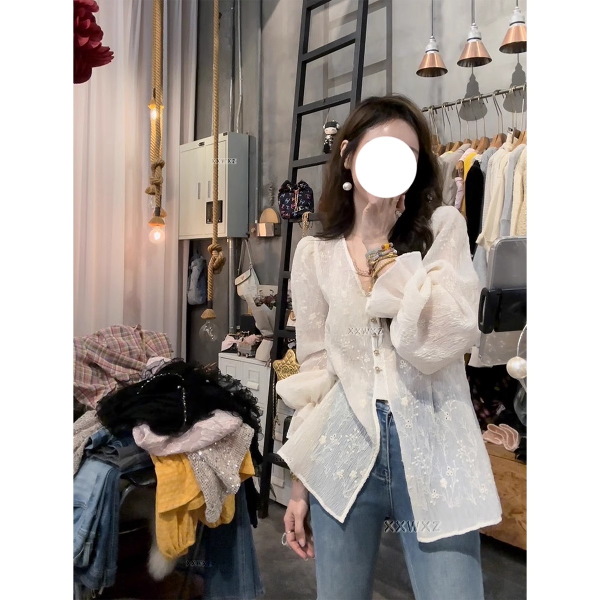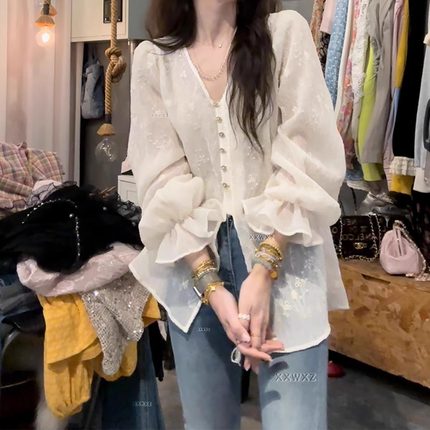 独特绝美提花刺绣白色泡泡袖雪纺衫女夏季设计感长袖防晒衬衫上衣