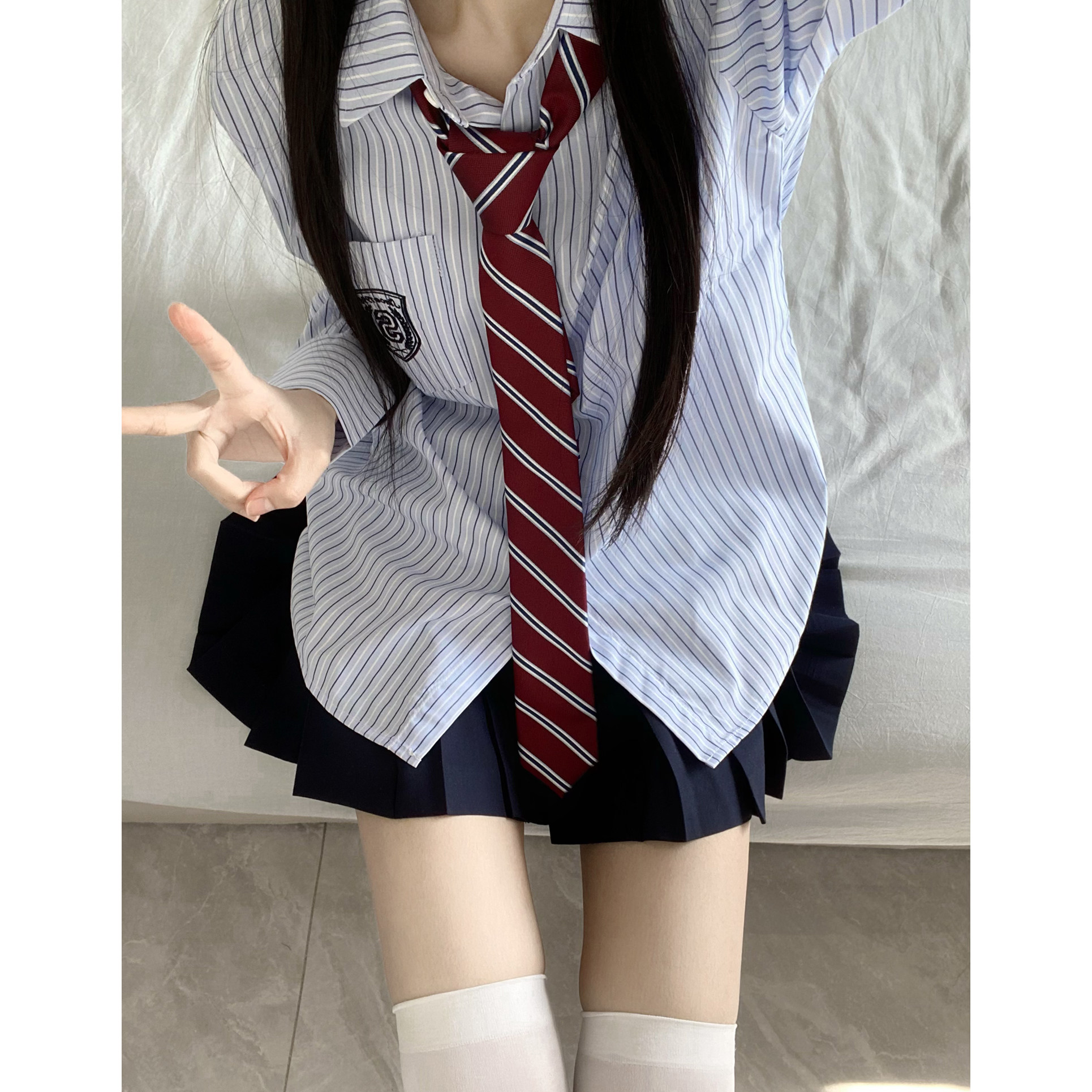 车厘子jk原创百搭绀蓝条纹长短袖衬衫女学院风制服衬衣百褶裙套装