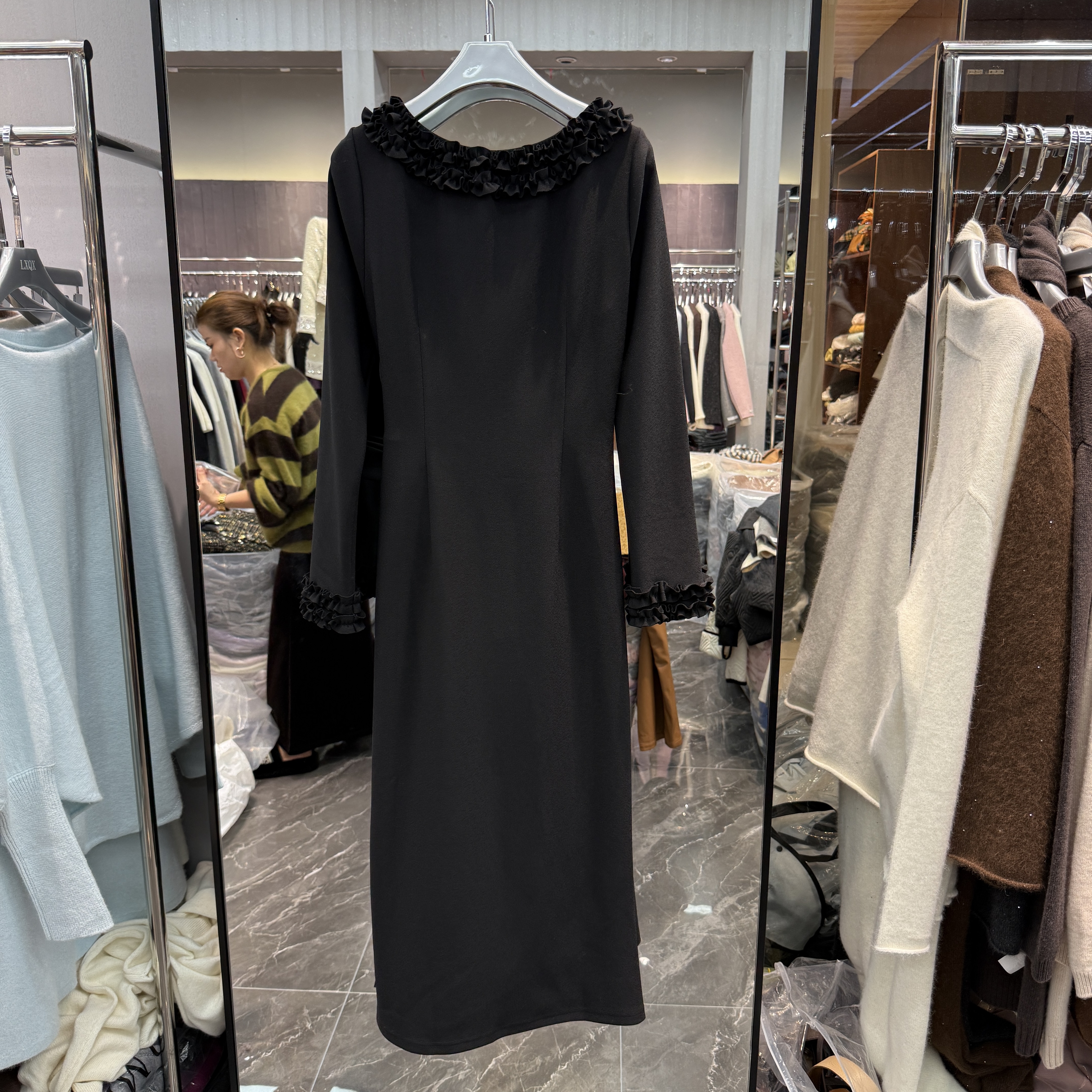 欧洲站2025秋冬新款一字肩木耳边拼接腰带束腰中长款连衣裙女3132