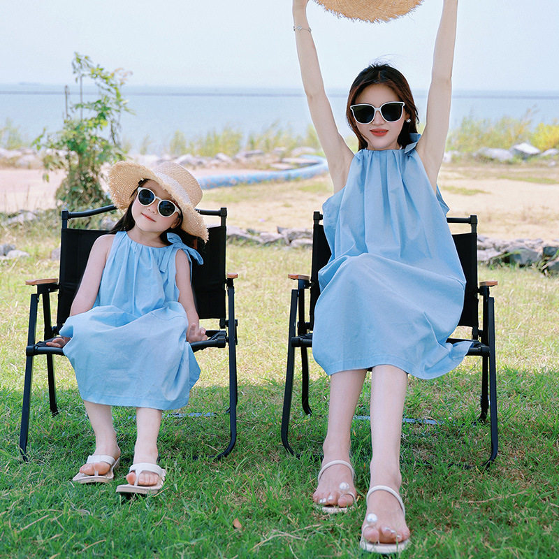 爆款新款夏季海边风三亚旅游度假挂脖长裙母女亲子装吊带连衣裙