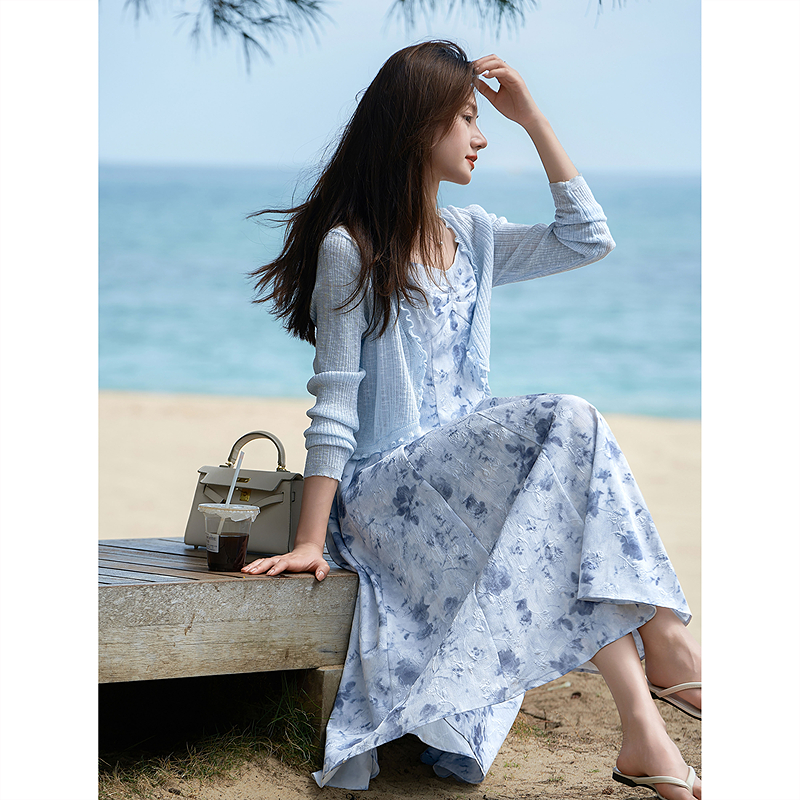 苏醒的乐园法式修身收腰显瘦开衫针织衫碎花吊带连衣裙两件套装