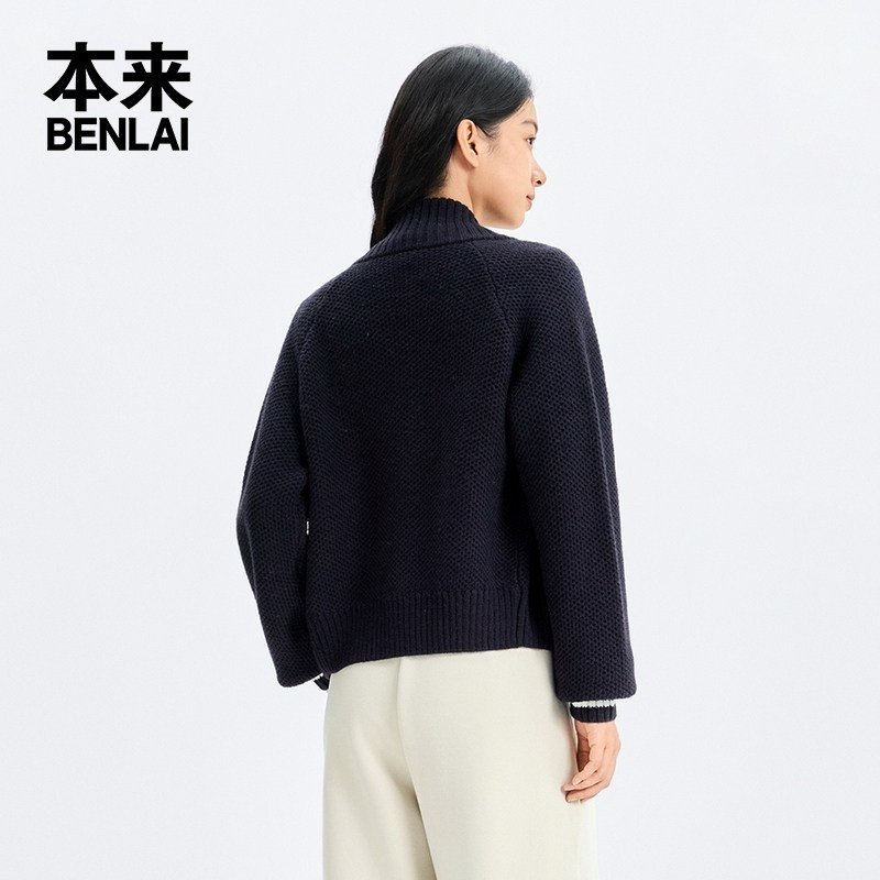 本来BENLAI女士羊毛混纺加厚立领针织开衫外套25冬新款BNT950010