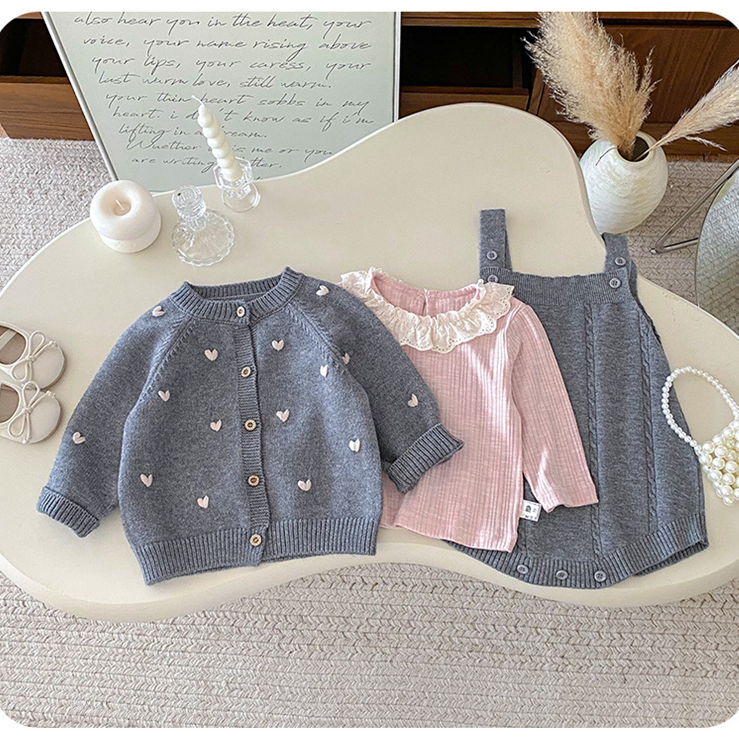 婴儿针织套装女宝宝韩版红色毛衣外套背带哈衣开衫满月百天小月龄
