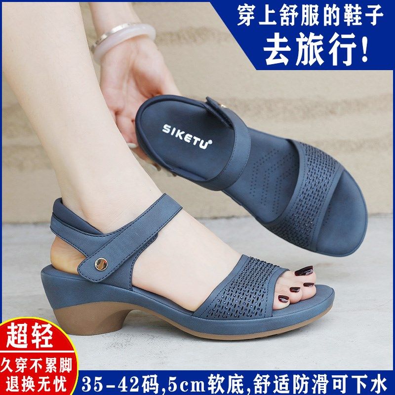 中高跟凉鞋女夏外穿2025新款水钻粗跟软底不O累脚防滑中老年妈妈