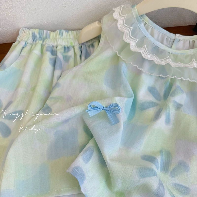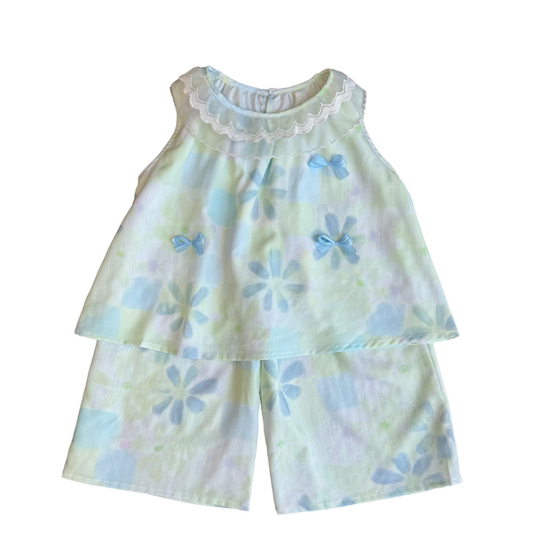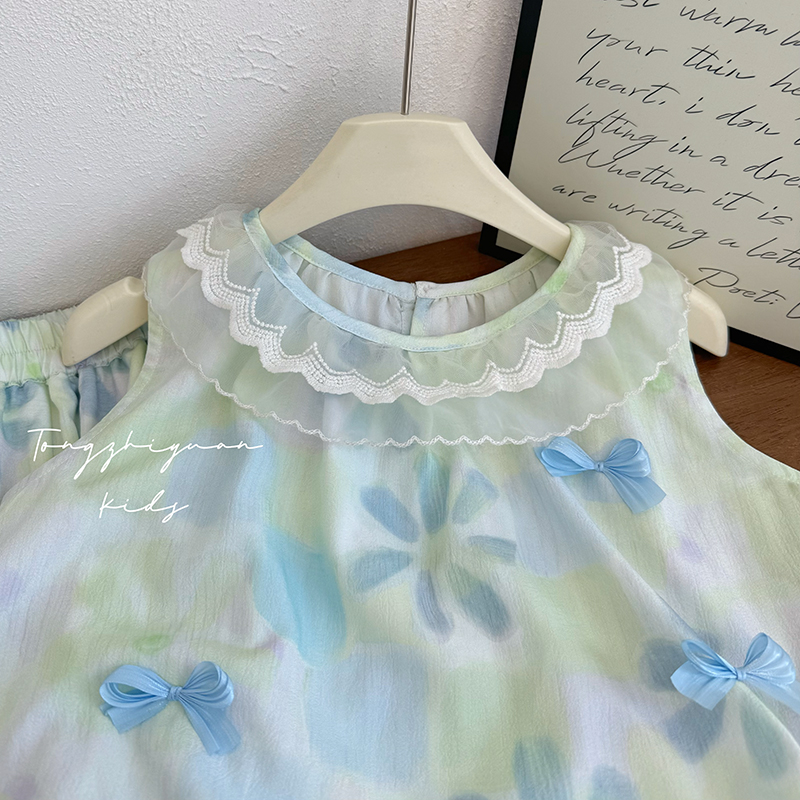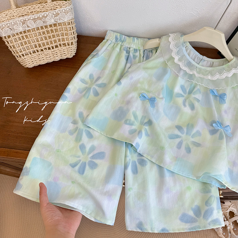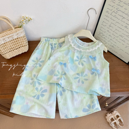 女童新款夏季韩版无袖花边领上衣七分裤套装女宝休闲时尚品质童装