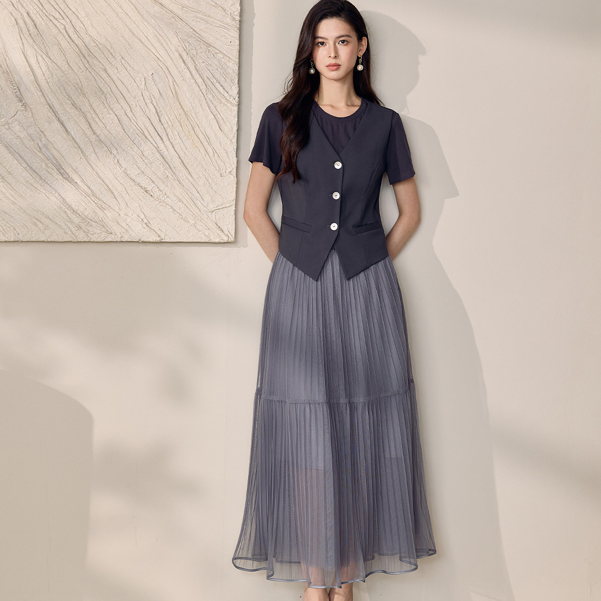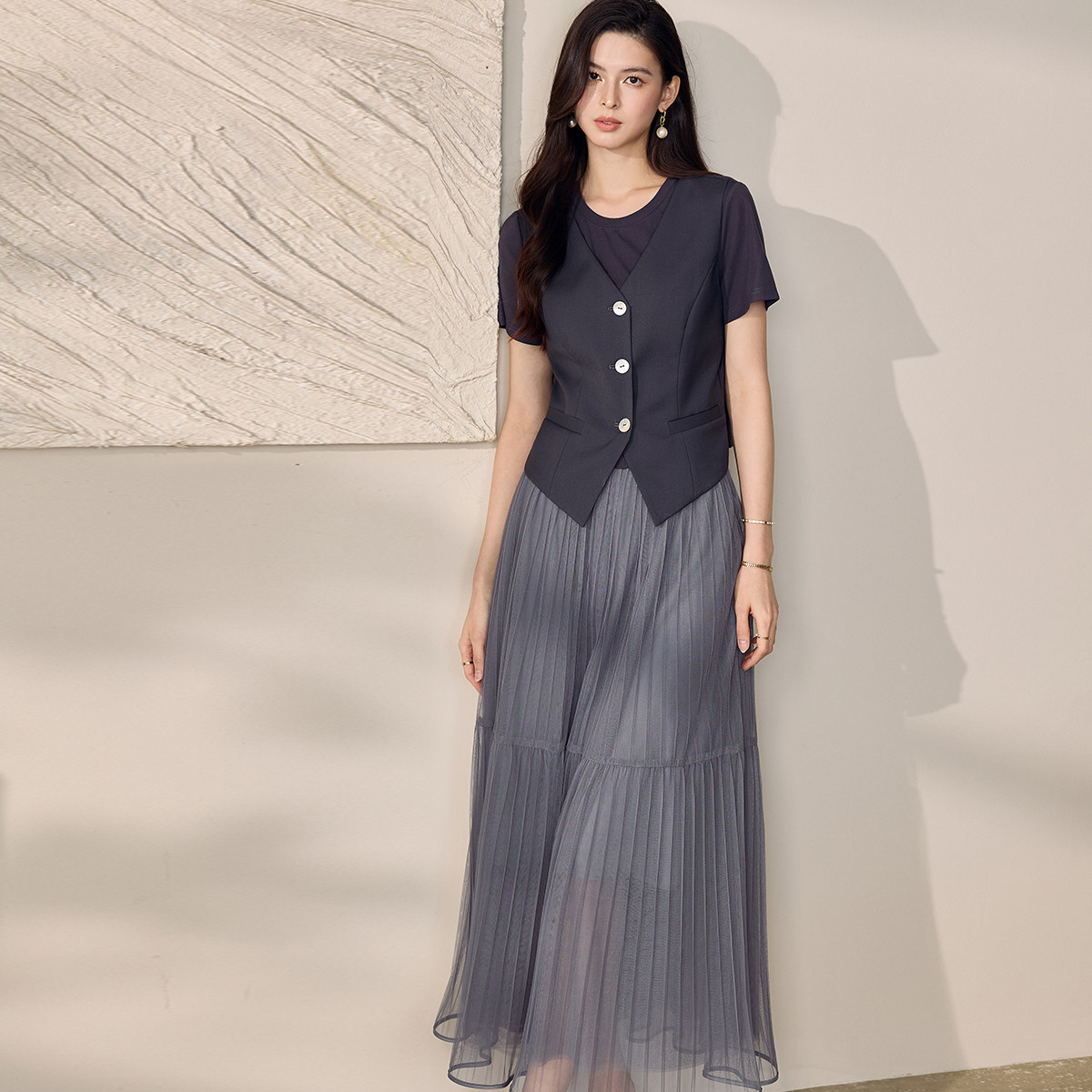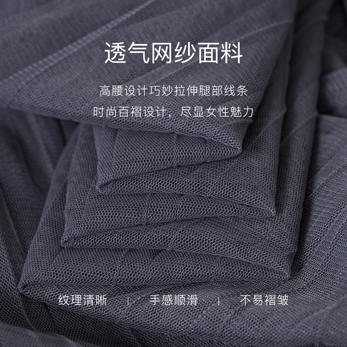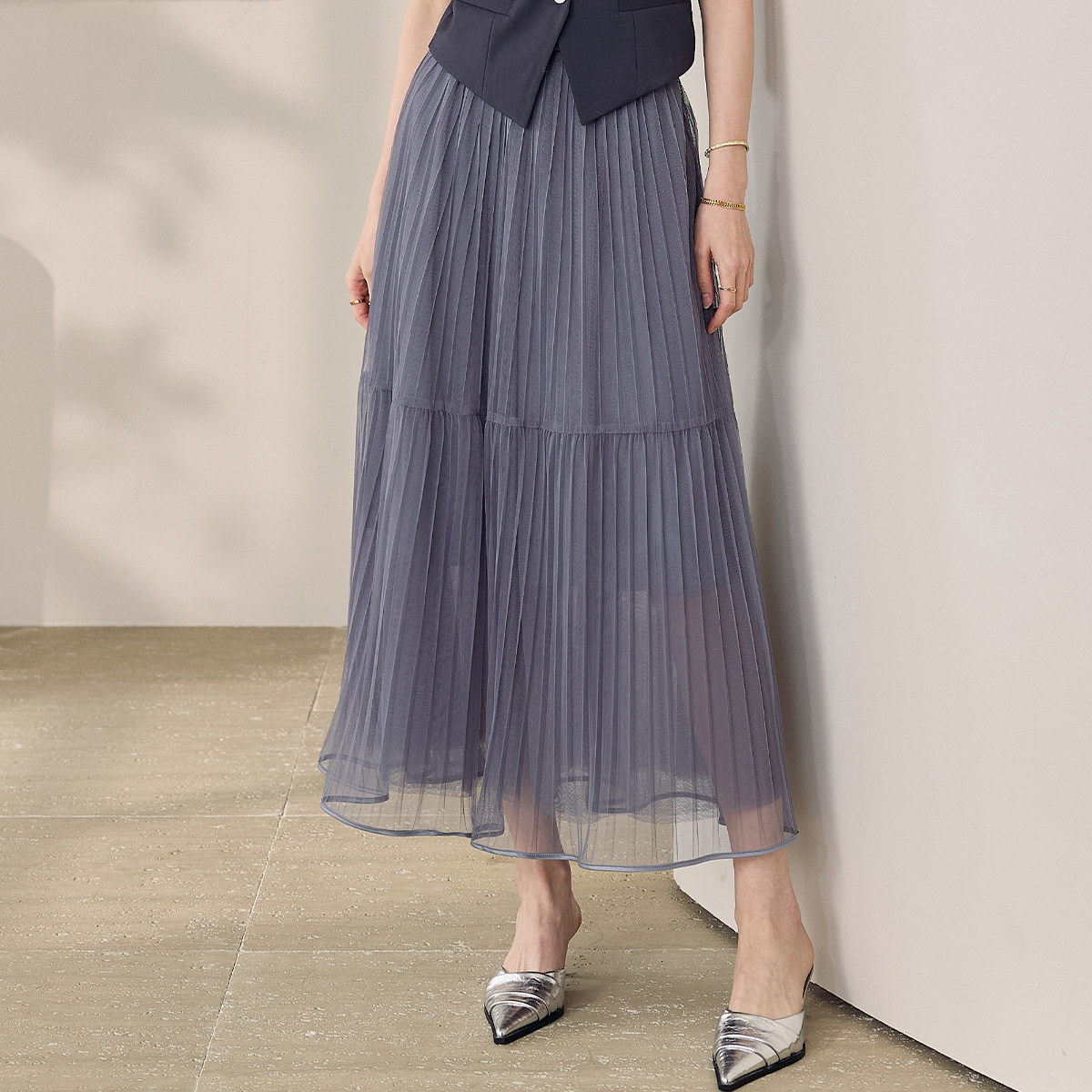 罗衣时尚百褶网纱半身裙2025秋季新款气质灰色拼接大摆长裙11993