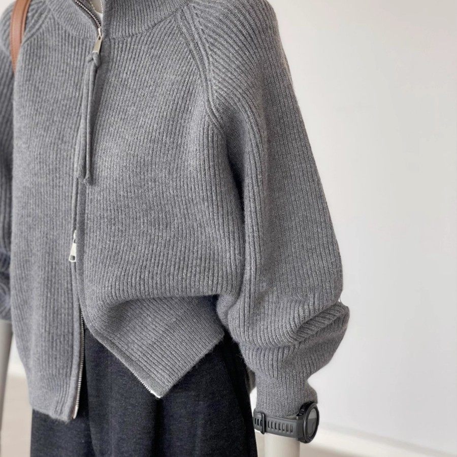 双拉链灰色高领针织开衫女秋冬季新款宽松慵懒风毛衣外套加厚上衣
