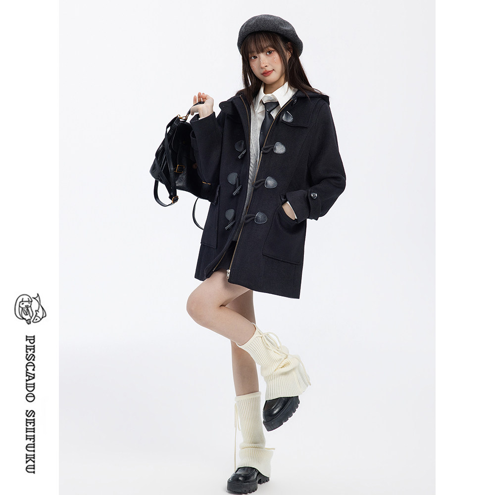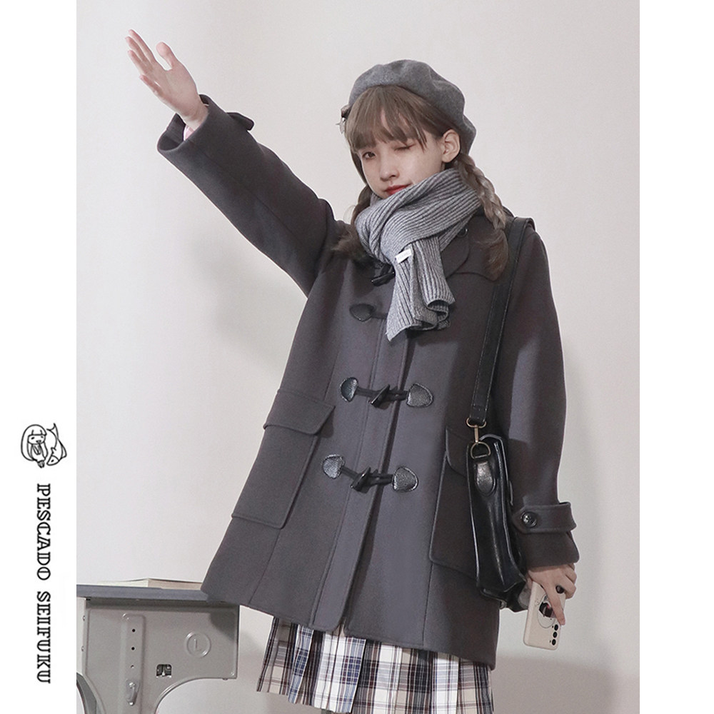 咸鱼衣橱 50%羊毛学院风牛角扣大衣女秋冬小个子加绒加厚毛呢外套