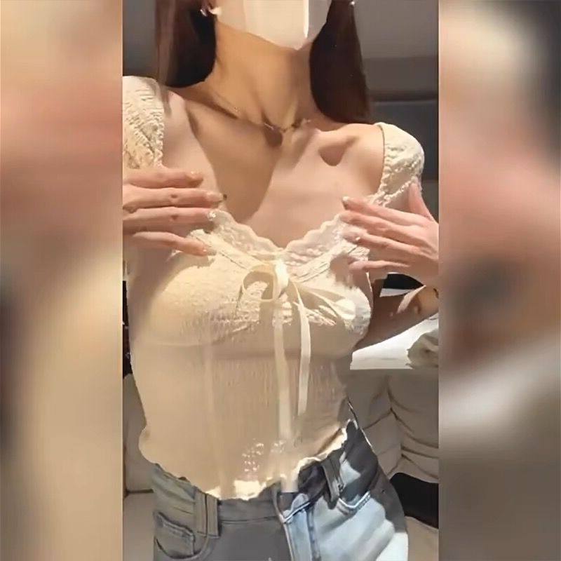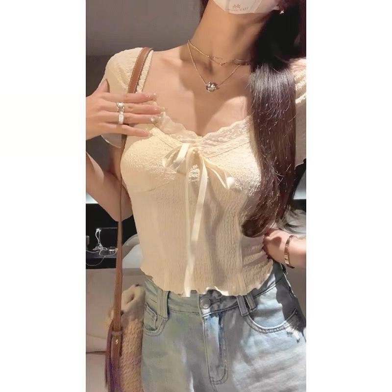法式杏色蕾丝鱼骨v领短袖上衣女夏季修身显瘦纯欲辣妹锁骨短款t恤