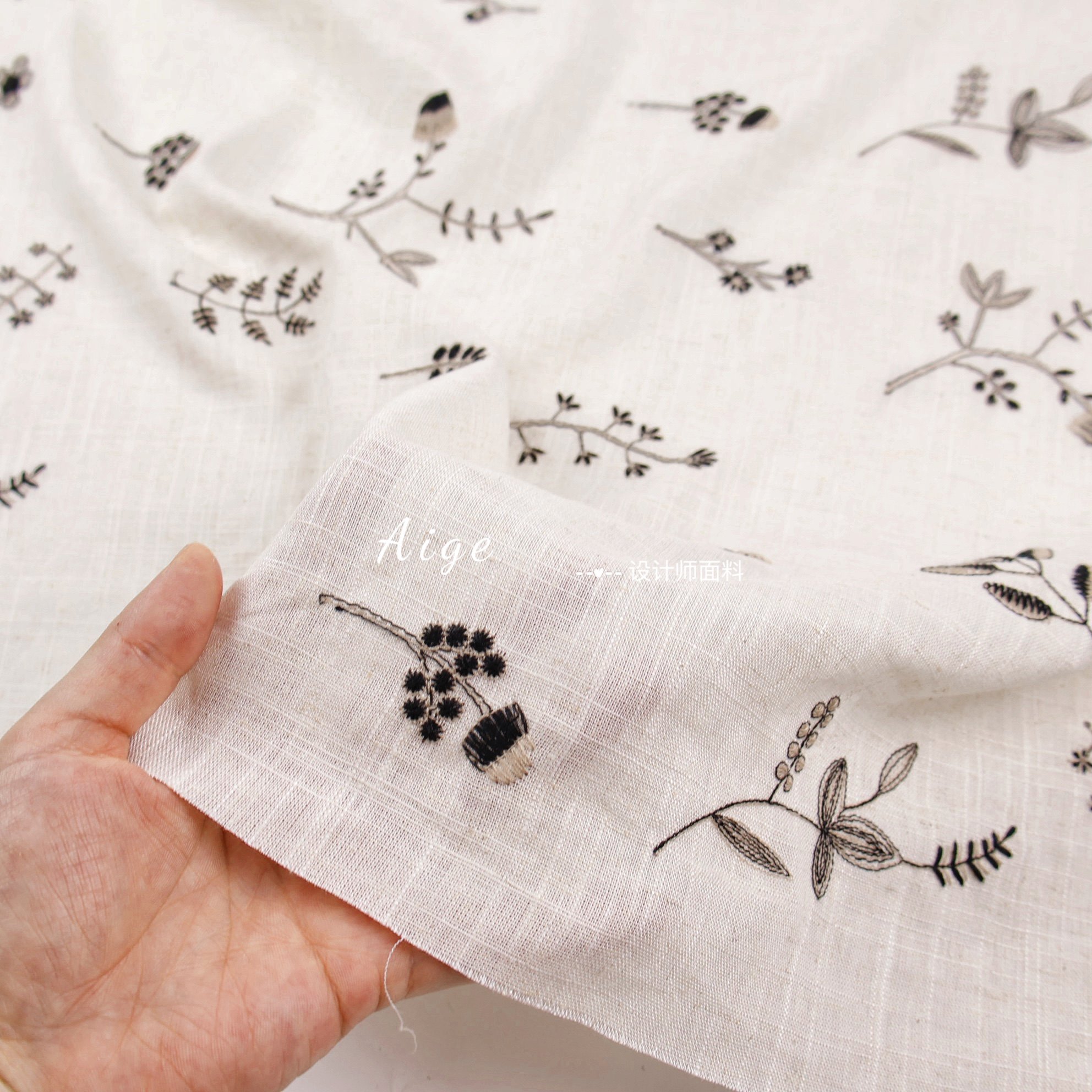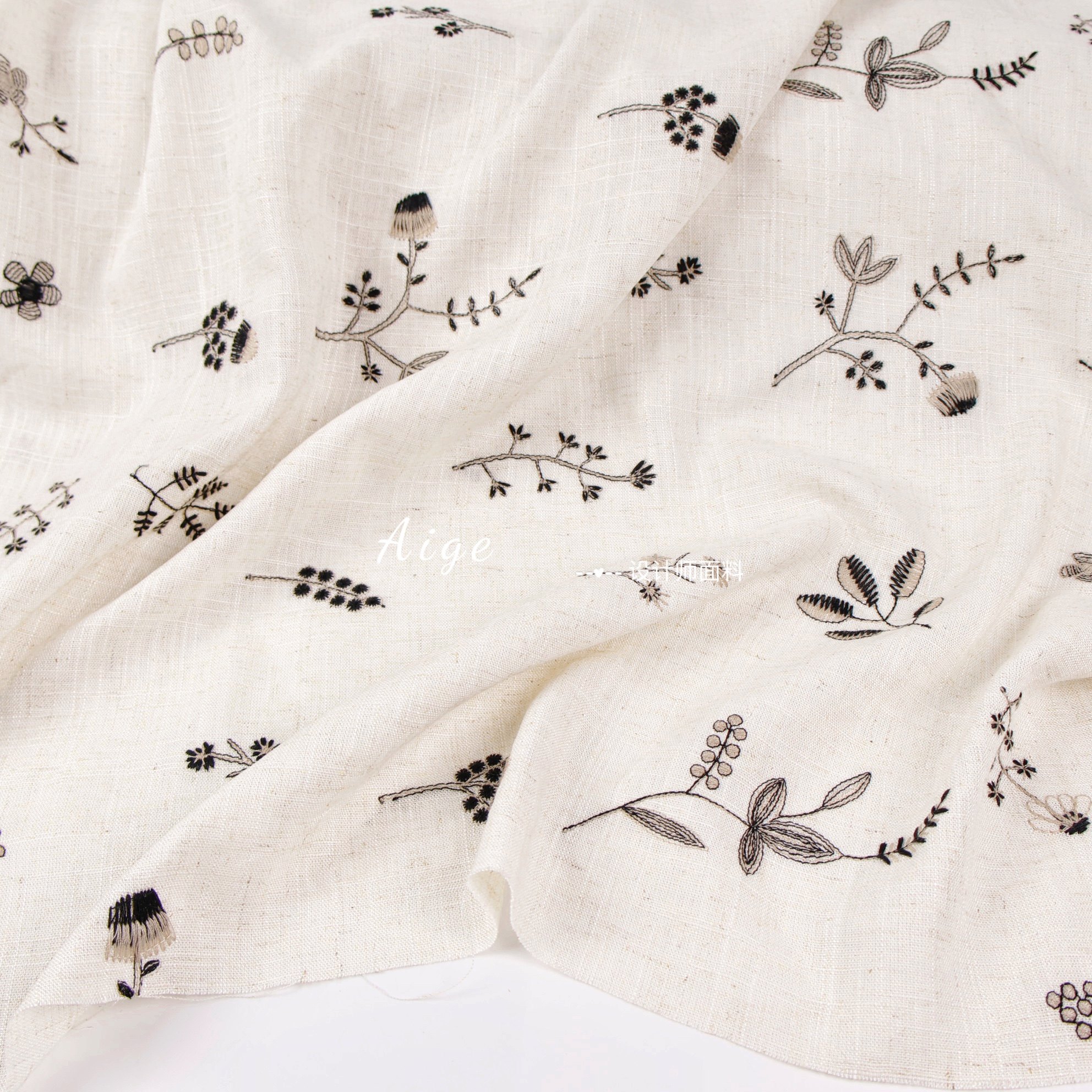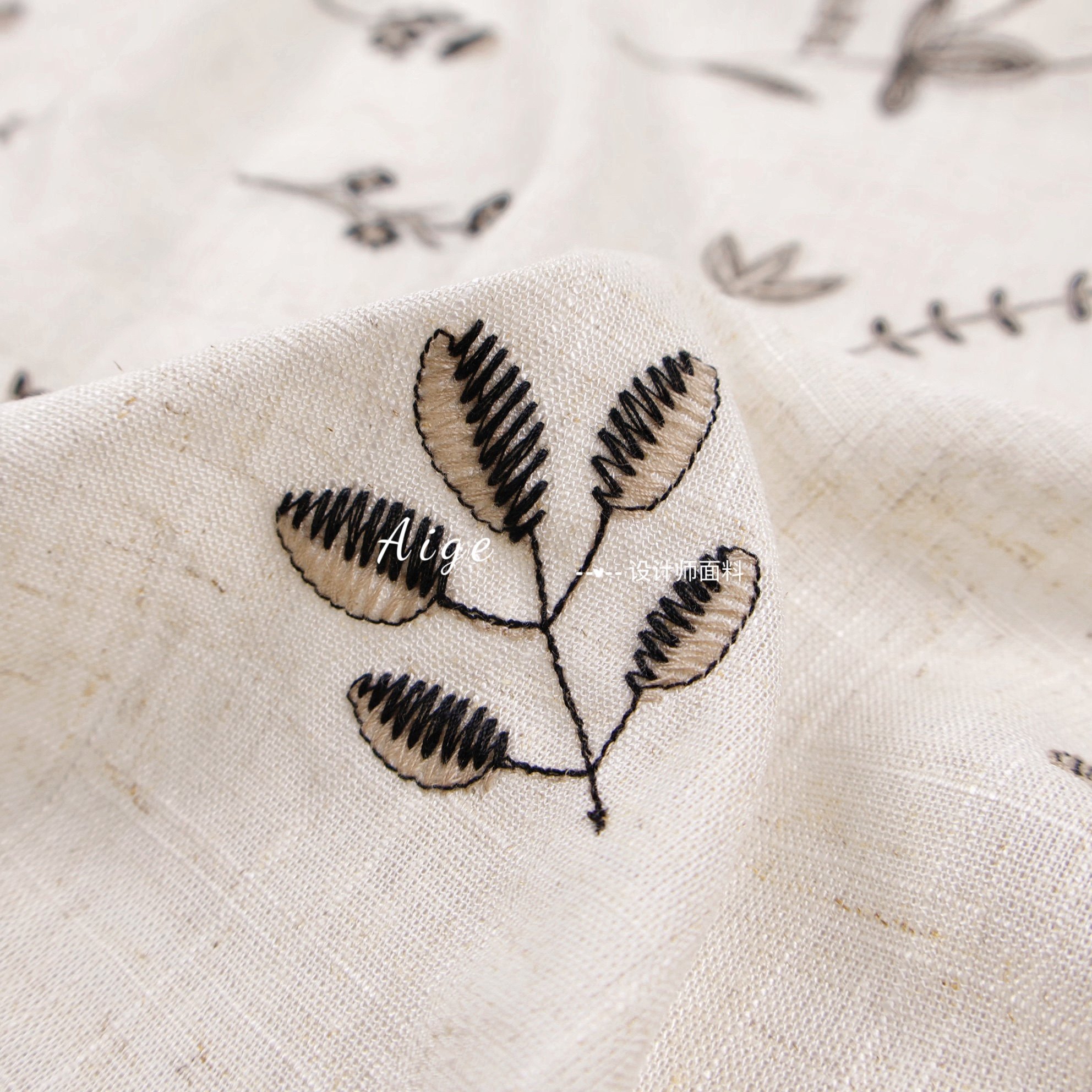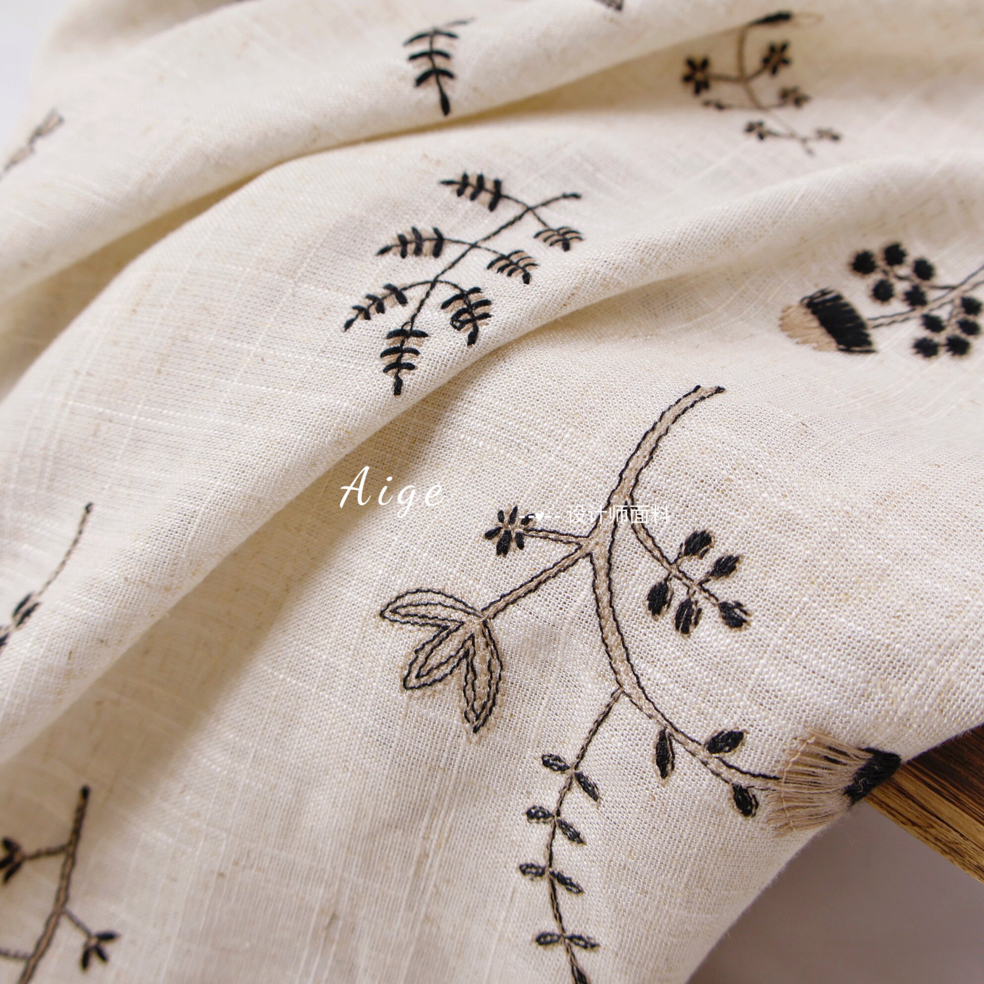 垂感亲肤 米色重工植物花朵刺绣纯亚麻面料衬衣连衣裙套装布料DIY