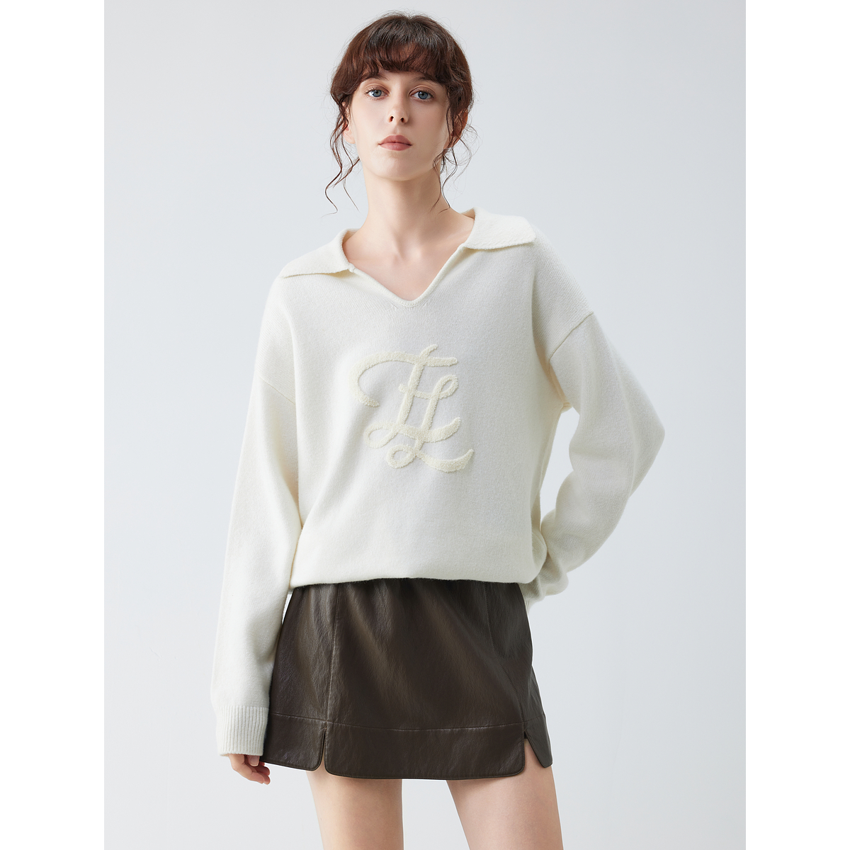 ELLE白色绵羊毛polo领针织衫
