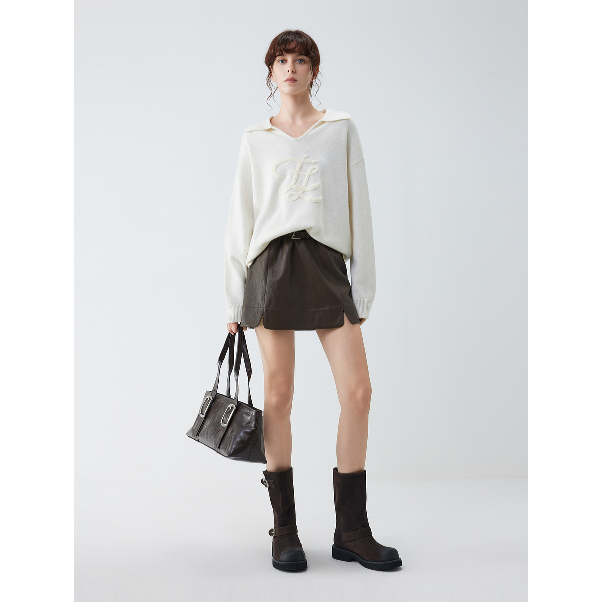 ELLE白色绵羊毛polo领针织衫女2025秋季新款套头宽松软糯通勤毛衣