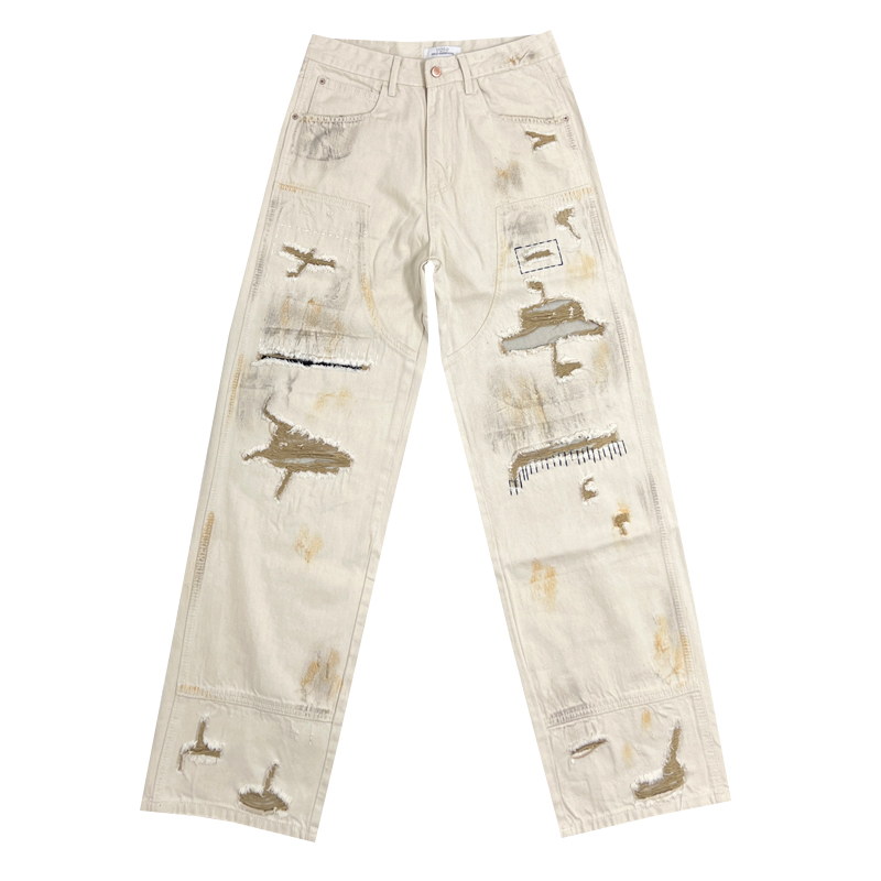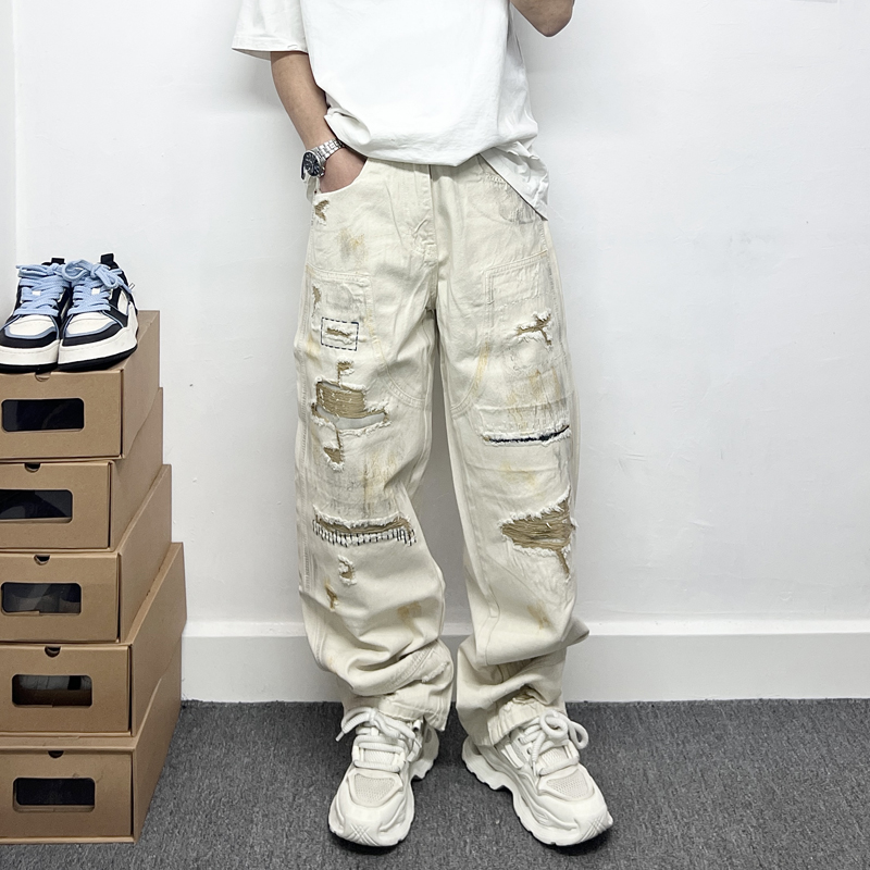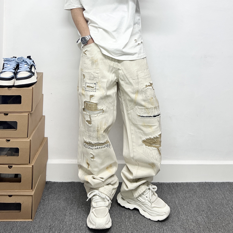 做旧破洞补丁牛仔裤男阔腿长裤子