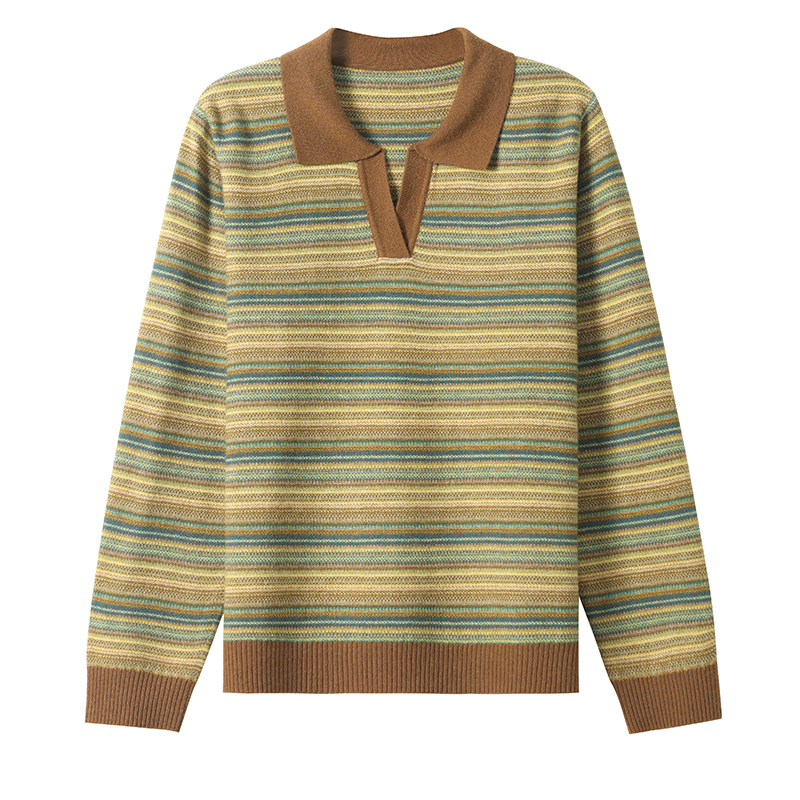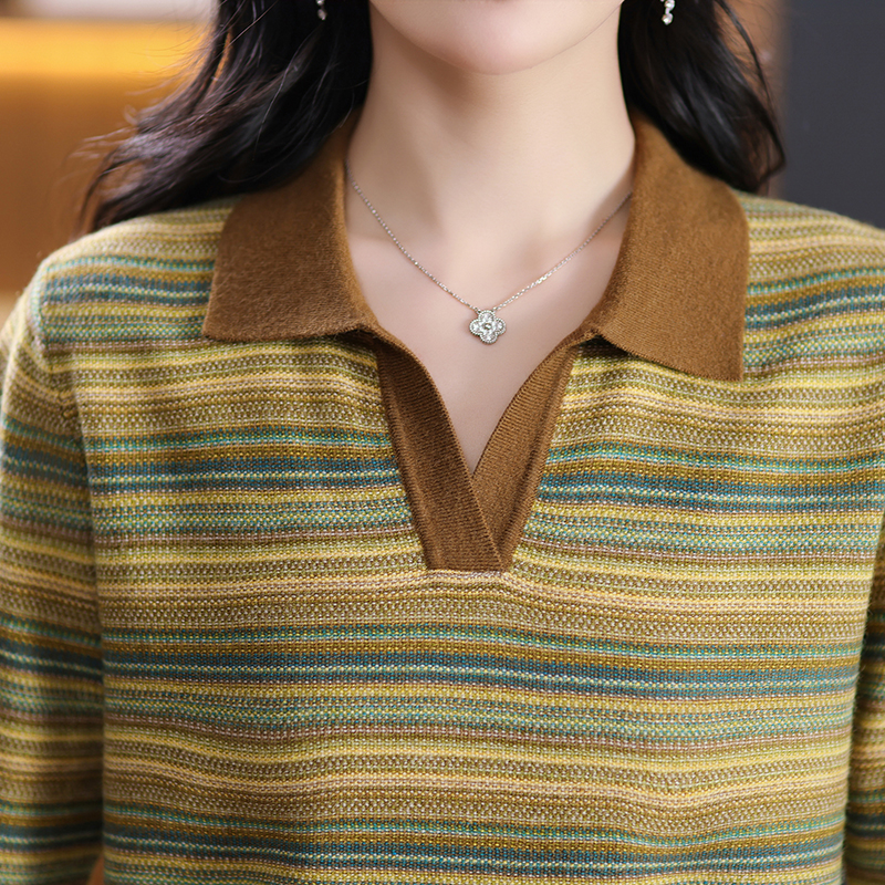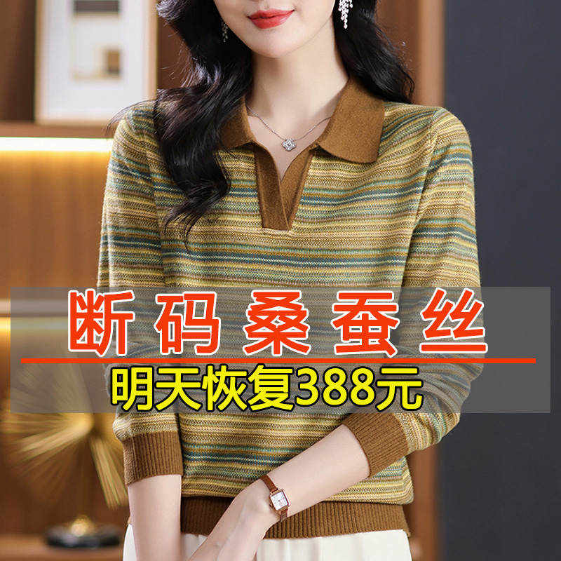 春秋新款桑蚕丝长袖t恤女翻领针织条纹妈妈上衣宽松遮肚子打底衫