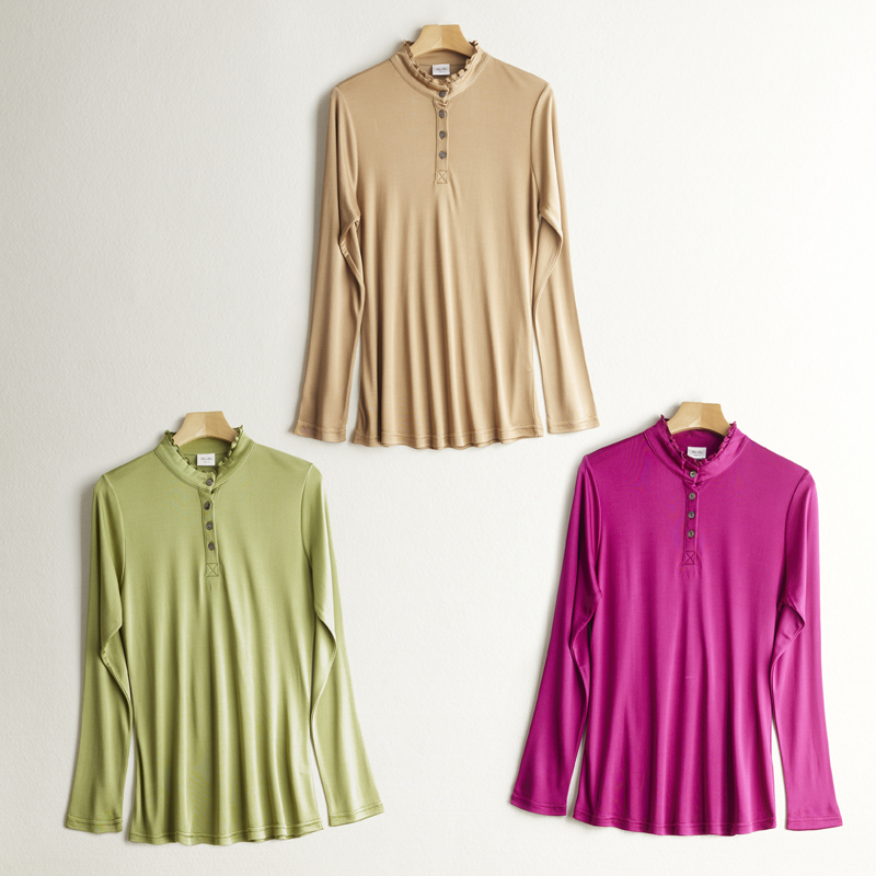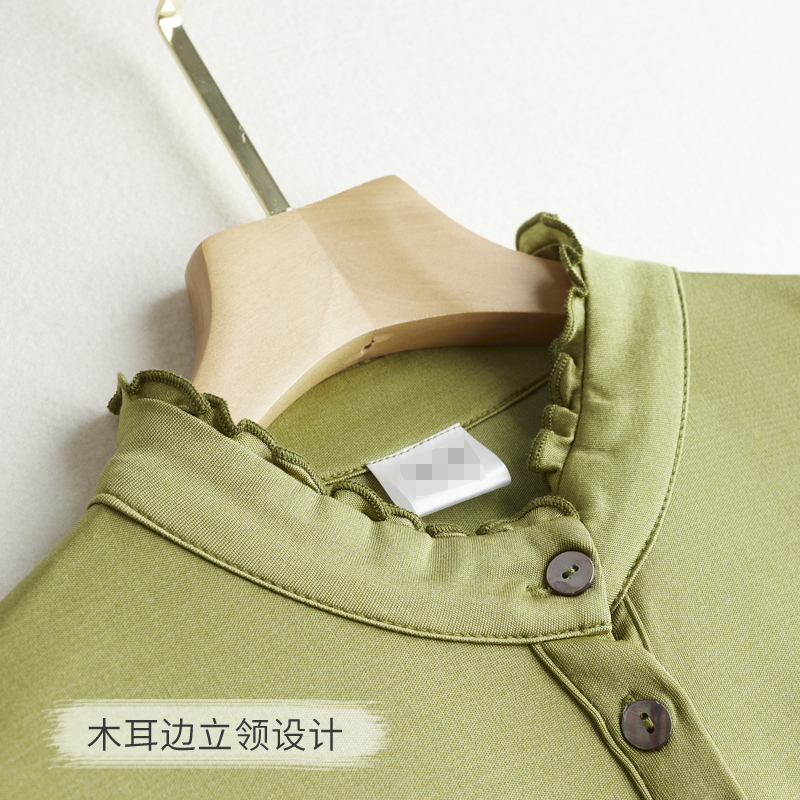 真丝衬衫女春秋桑蚕丝纯色长袖打底衫木耳边立领前开扣套头上衣