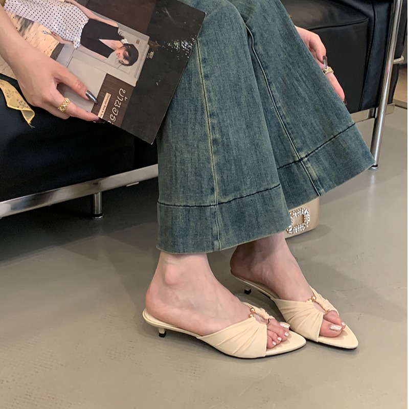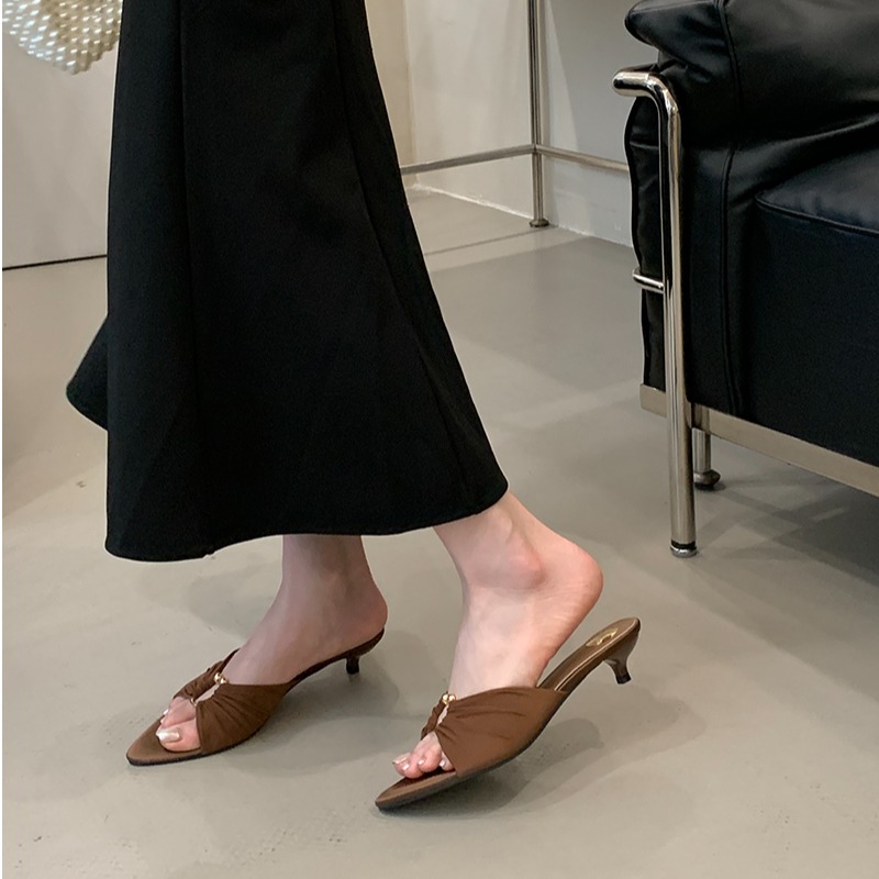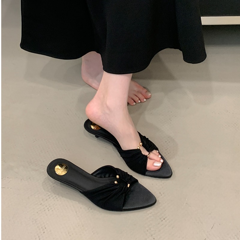 2025夏季时尚露趾女鞋中跟尖头绸缎凉鞋欧美气质金属扣猫跟拖鞋