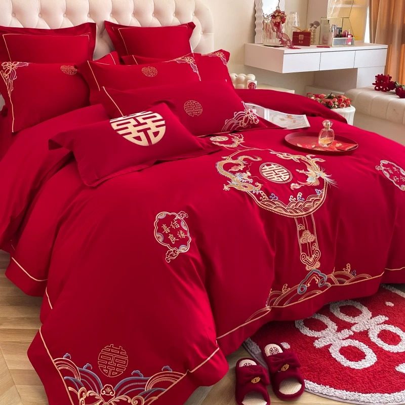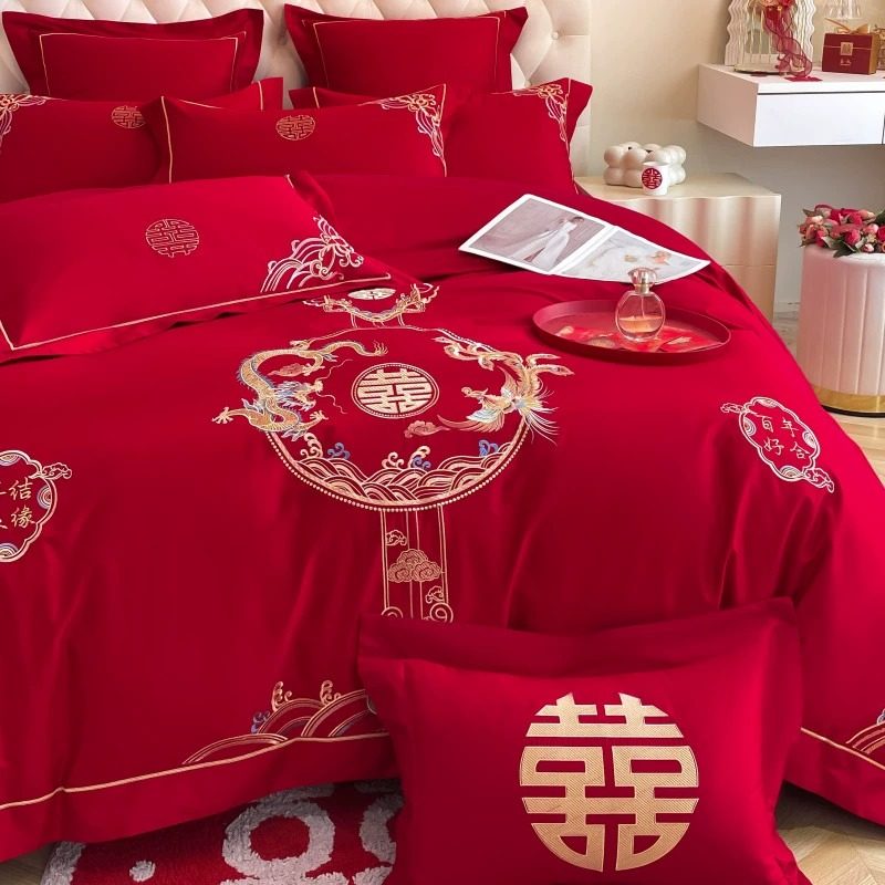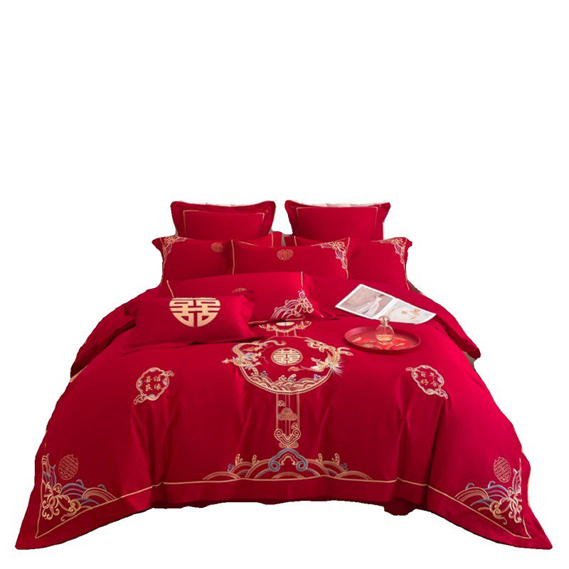 中式简约刺绣婚庆四件组大红色床单被套结婚床上用品婚房