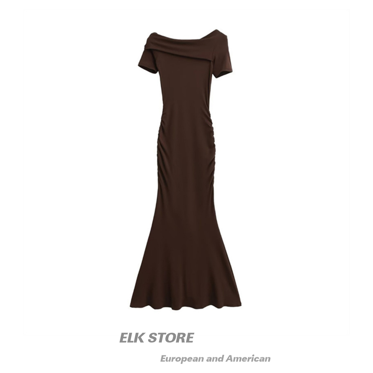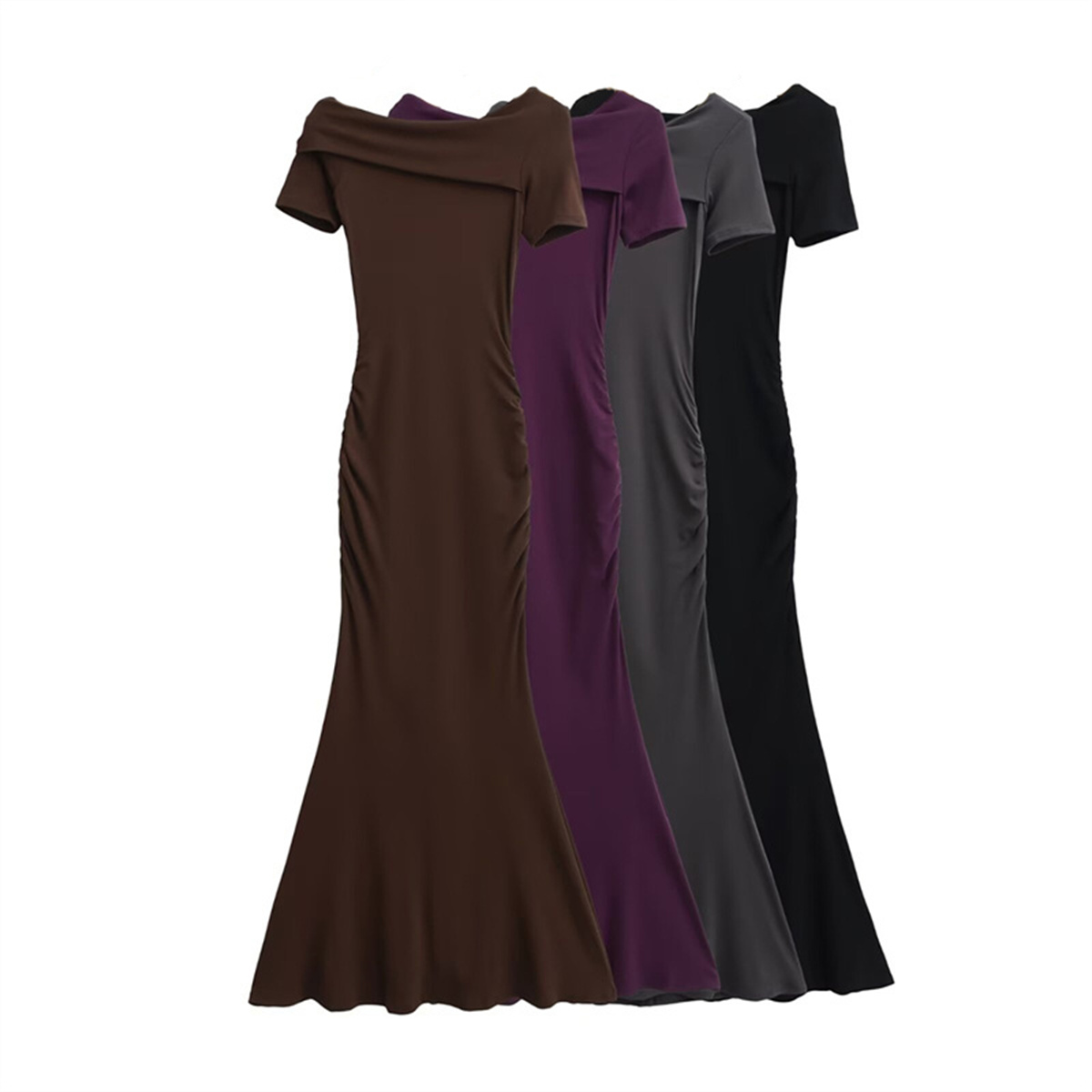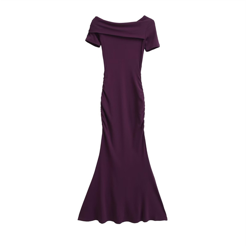 法式性感修身包臀鱼尾长裙新款斜肩短袖连衣裙夏季收腰褶皱裙子