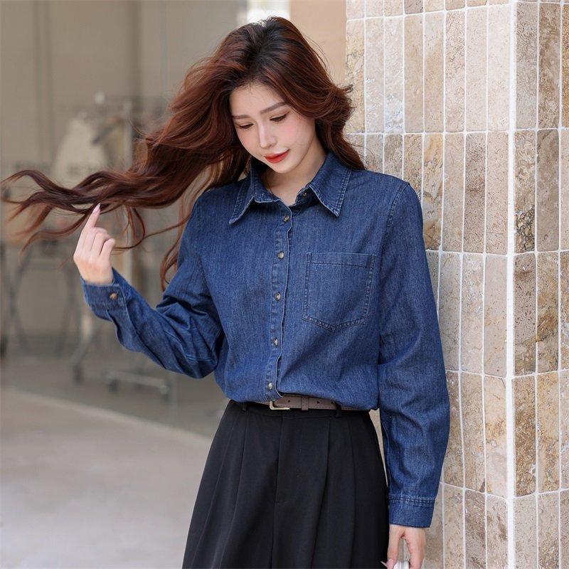 复古蓝色牛仔衬衫外套女2025春秋季小个子设计感长袖衬衣新款上衣