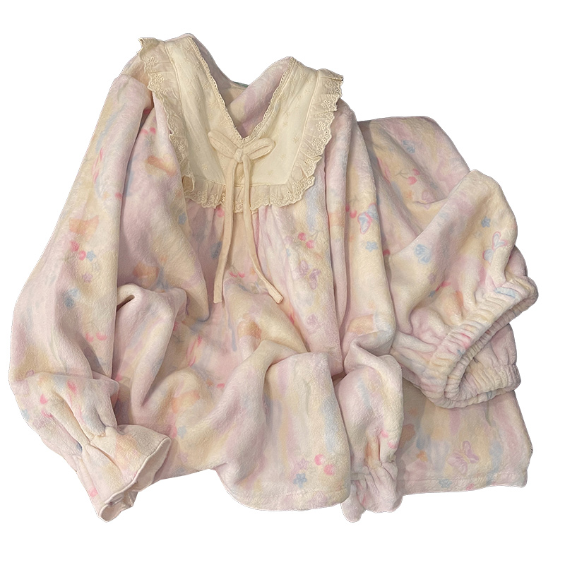 睡衣女款秋冬季珊瑚绒加绒加厚甜美可爱花边套头法兰绒家居服套装