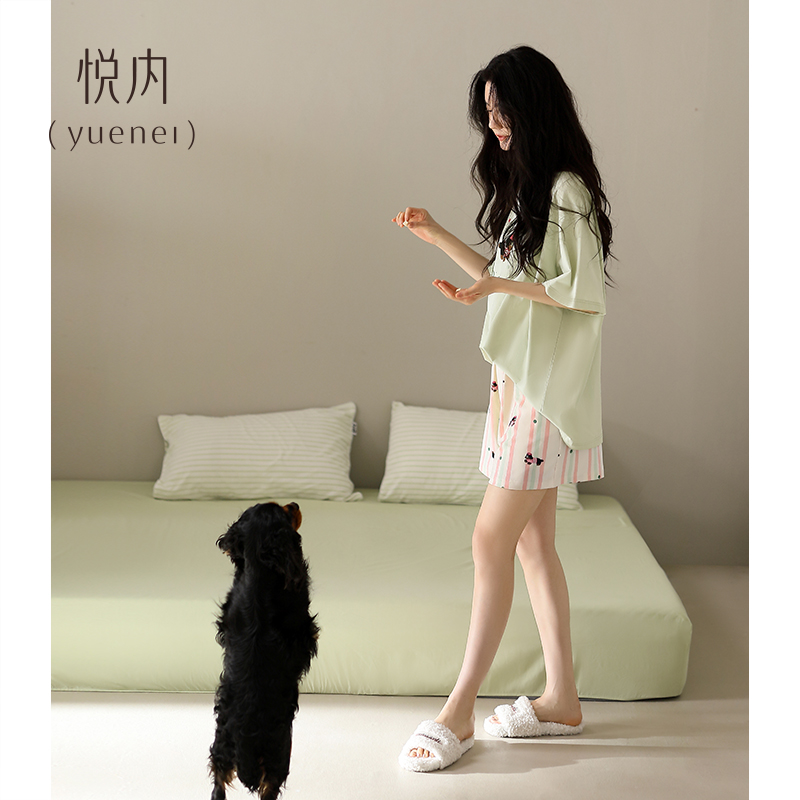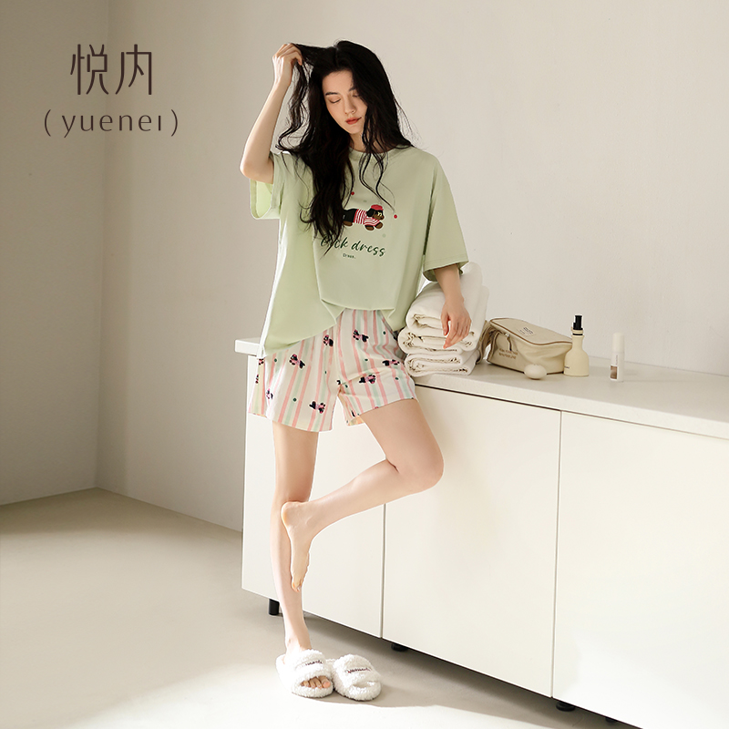 悦内带胸垫睡衣女款夏季夏天款纯棉短袖短裤短裤家居服休闲可外穿